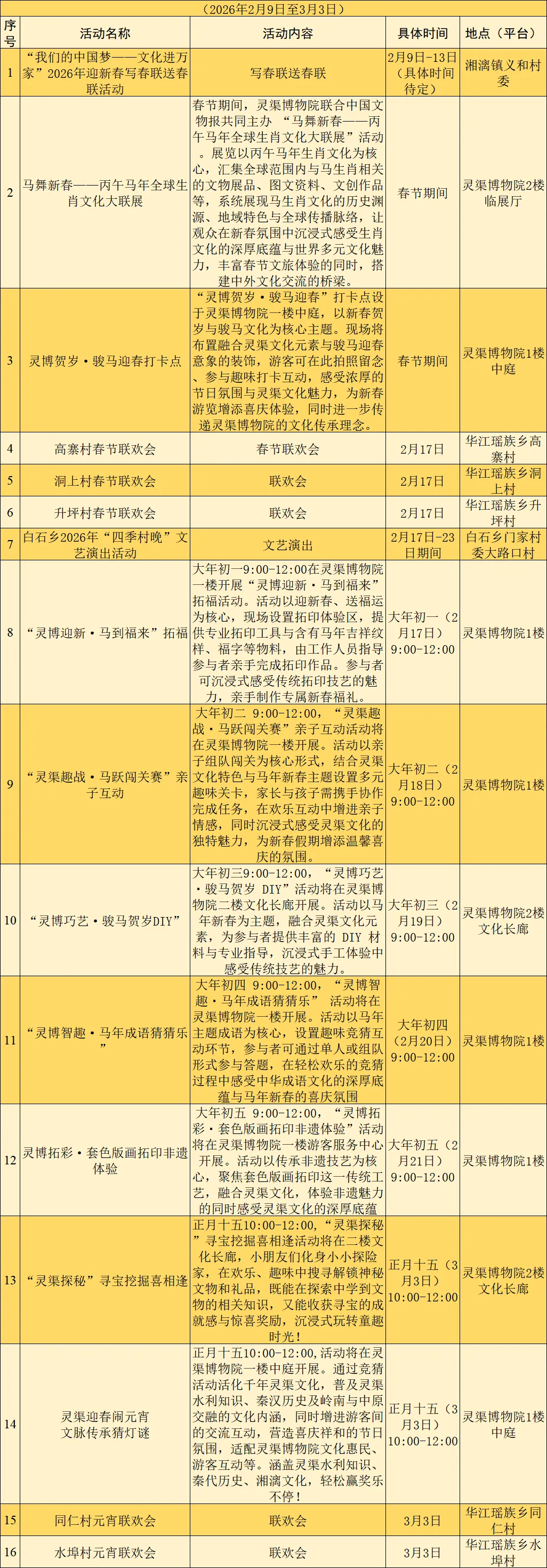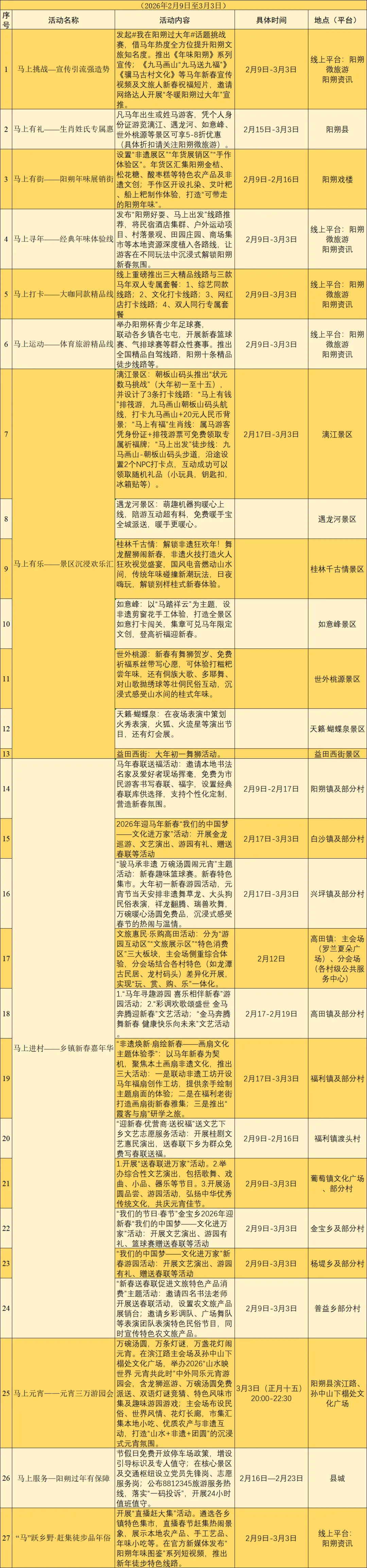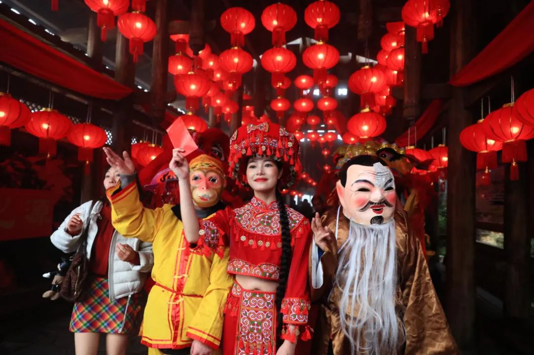 恭城三庙两馆景区推出马年新春特辑。春节期间,景区策划推出“新春入庙礼”、“鸣钟祈福”等传统活动,上演《天官赐福》等桂剧经典,并设置“趣味射箭”、“福马纳福圈”等互动游园游戏,联动多家酒店民宿提供住宿优惠,打造沉浸式春节体验。