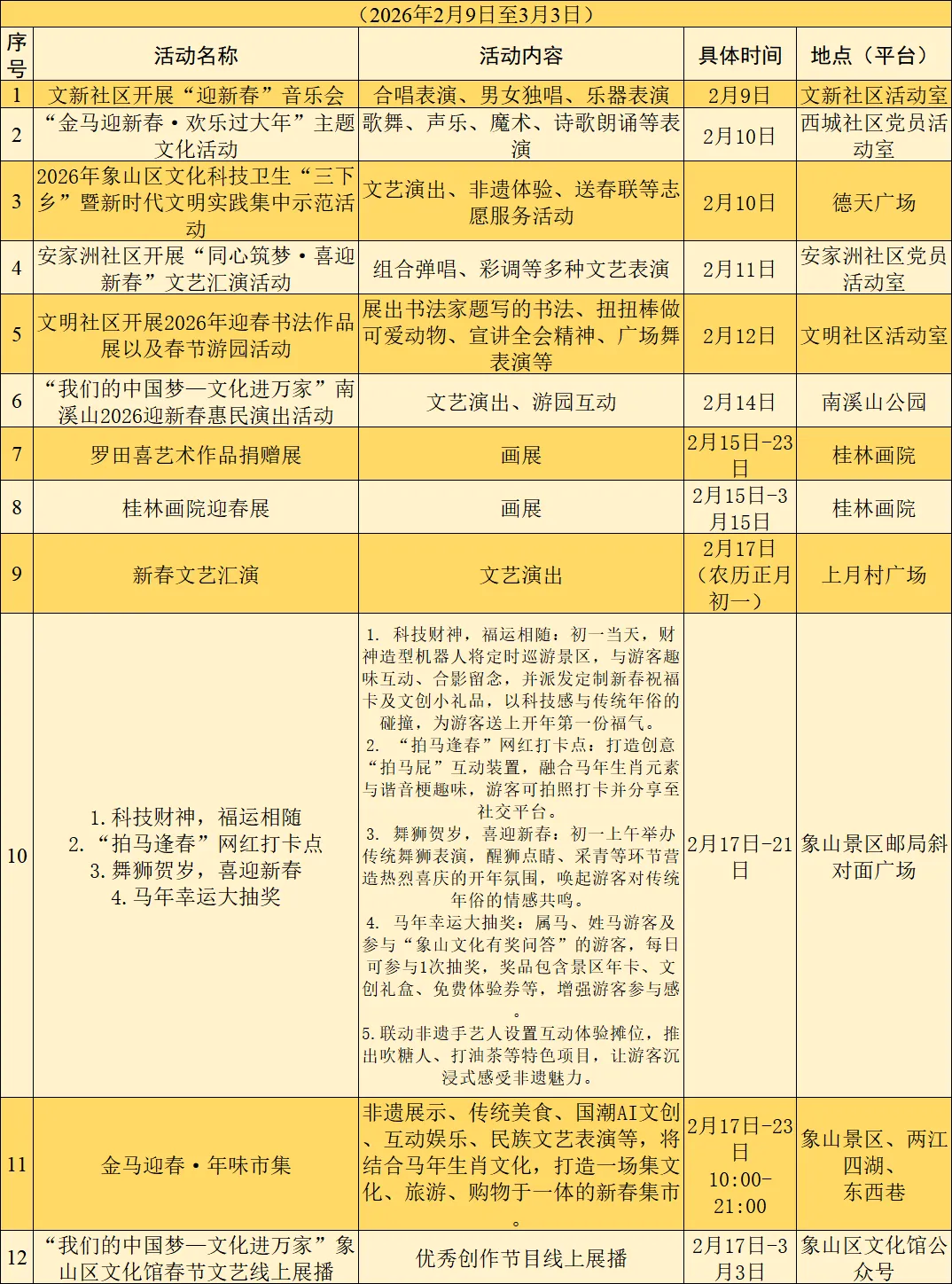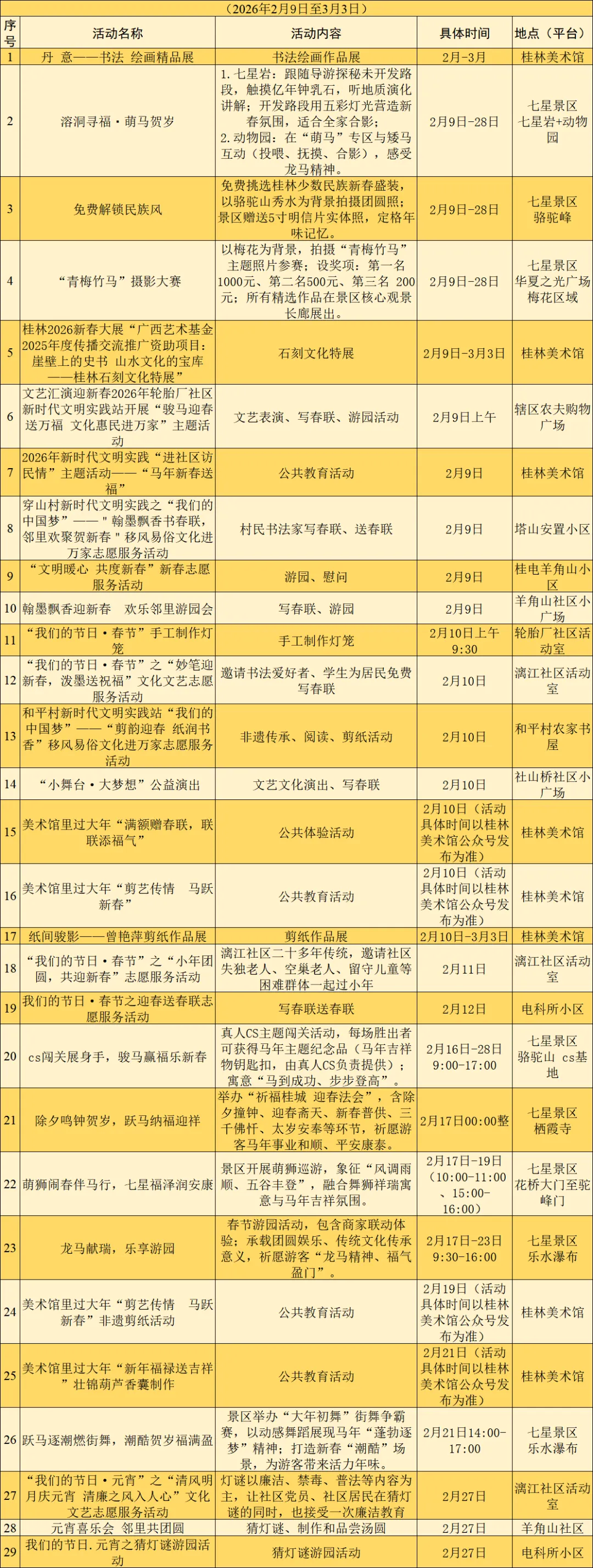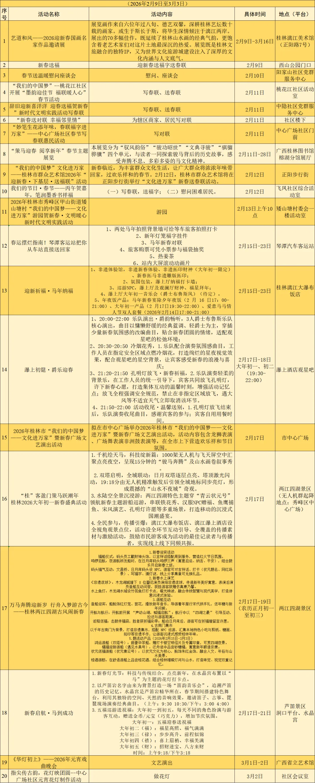 由桂林旅游股份有限公司承办的2026年桂林市春节文化旅游活动,将于农历大年初一(2月17日)19:00在桂林市中心城区隆重举行。