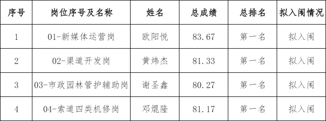 根据《2026年吉安武功山景区开发有限公司面向社会公开招聘劳务派遣人员公告》要求,2026年吉安武功山景区开发有限公司面向社会公开招聘劳务派遣人员岗位已完成了线上报名、资格审查、面试等工作,现将拟入闱公示名单公告如下: