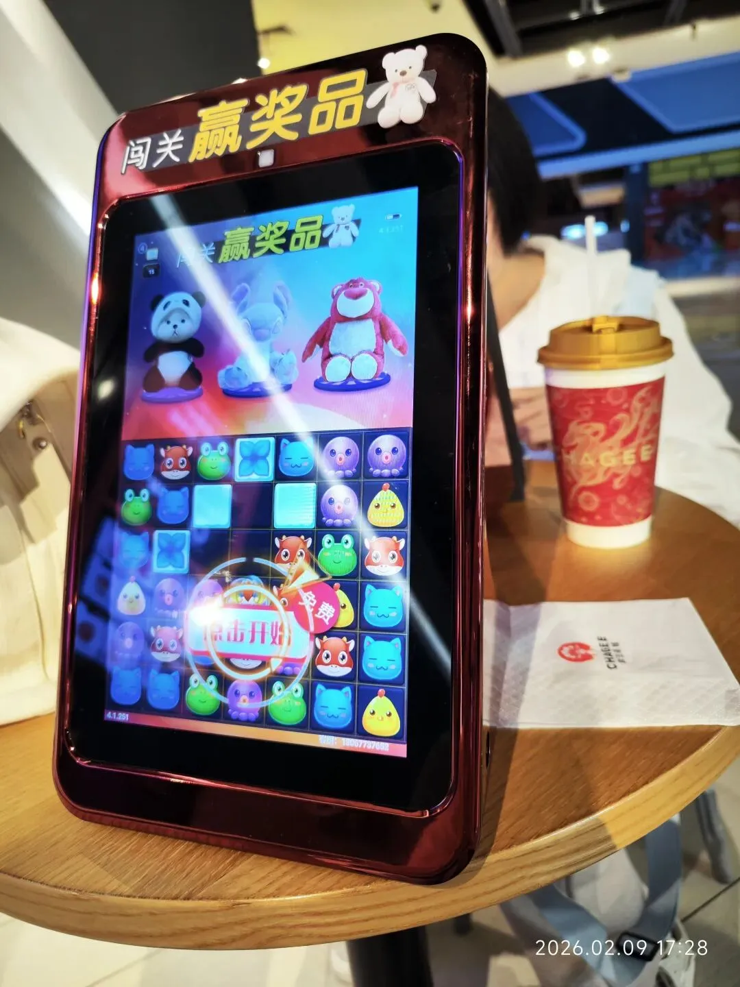 老公怕我等他无聊,建议我看看电影,但实在没什么值得看的片子。就在那时,在电影院,我看到了桌上摆放的游戏机,就玩了起来,还去兑换了免费奖品钥匙扣。