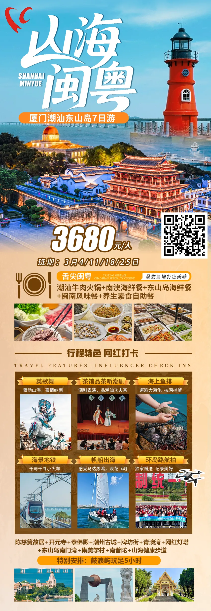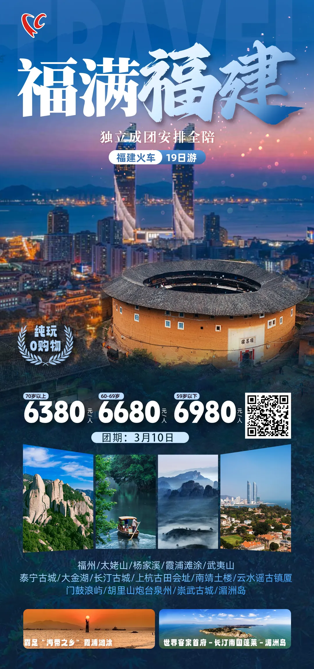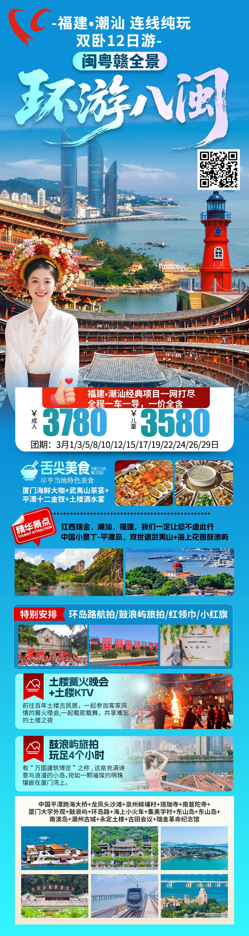 🐾全景覆盖:中国小垦丁-平潭岛、双世遗武夷山主景区、海上花园鼓浪屿、泉州蟳埔村、海天佛国珞珈寺、永定土楼、龙岩古田会议、瑞金等