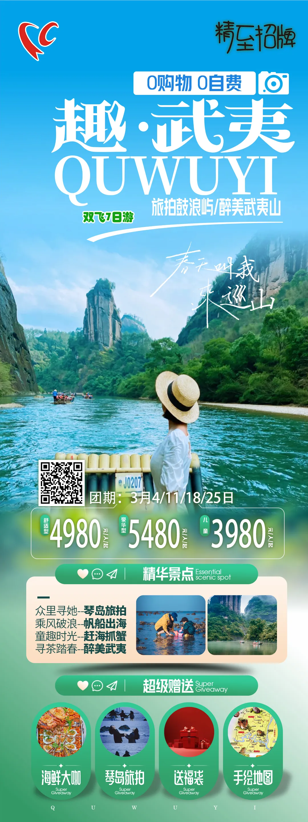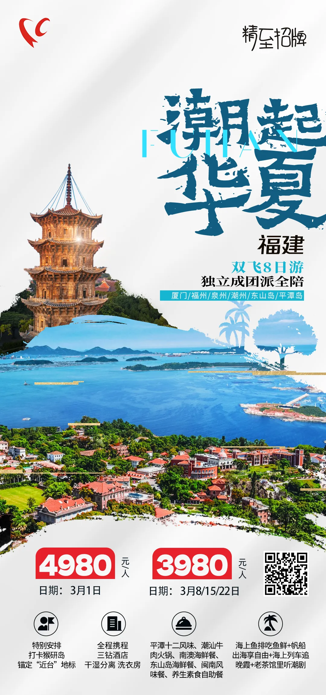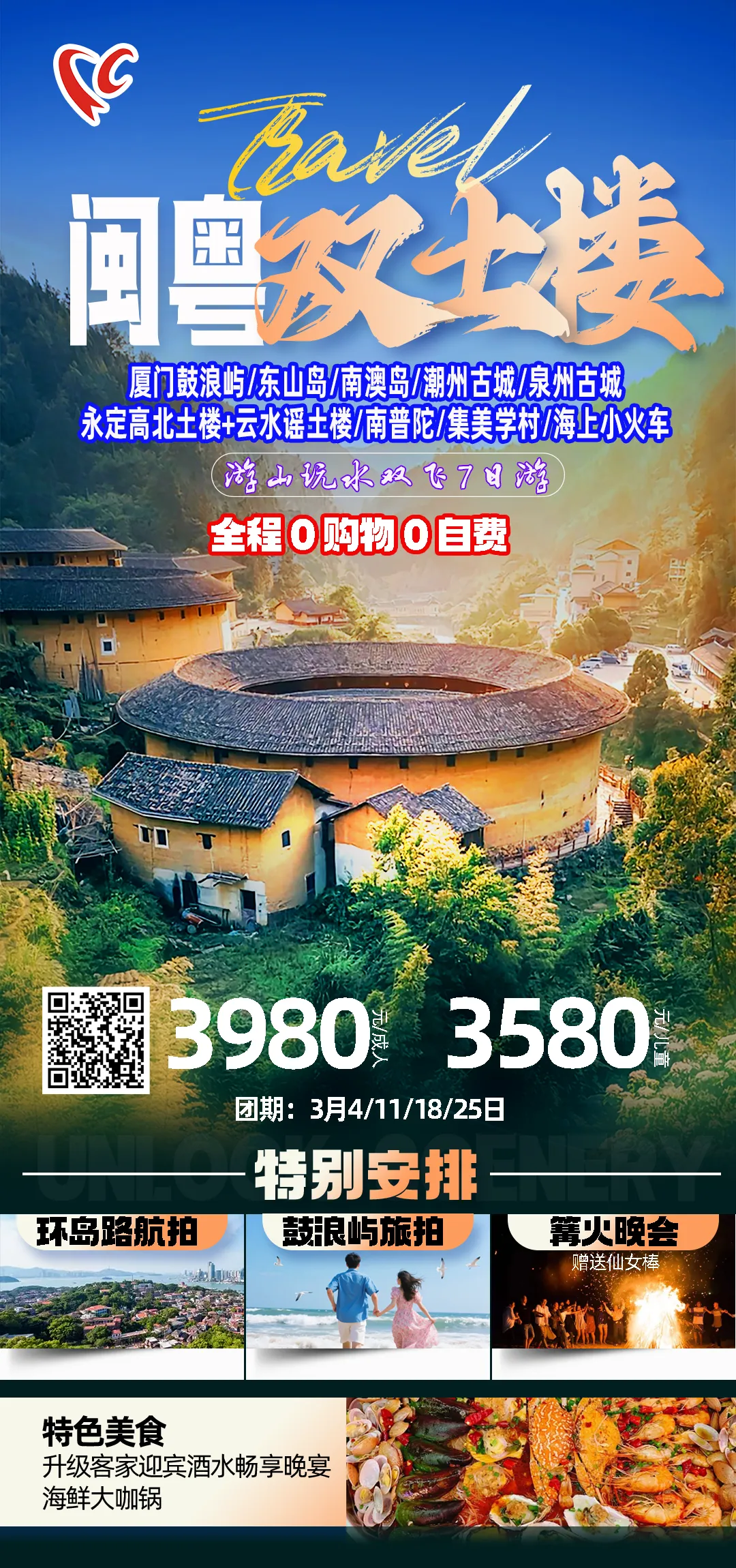🐾全景覆盖:中国小垦丁-平潭岛、双世遗武夷山主景区、海上花园鼓浪屿、泉州蟳埔村、海天佛国珞珈寺、永定土楼、龙岩古田会议、瑞金等