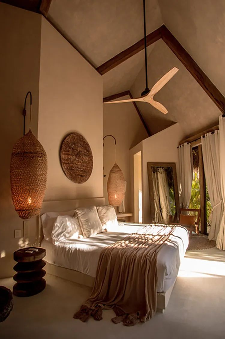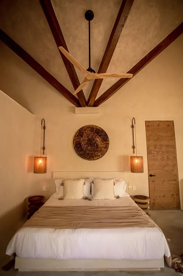 建筑风格唤起了中美洲文化,并利用现代解决方案与当地对生态影响较小的材料(如石头和木材)相结合,将它们与当下联系起来。朴素的墙壁、天然的材料、暖色调的家具和物品构成了整个空间,质朴的材料充满在舒适的氛围里,表达了设计师与自然共生的理念。