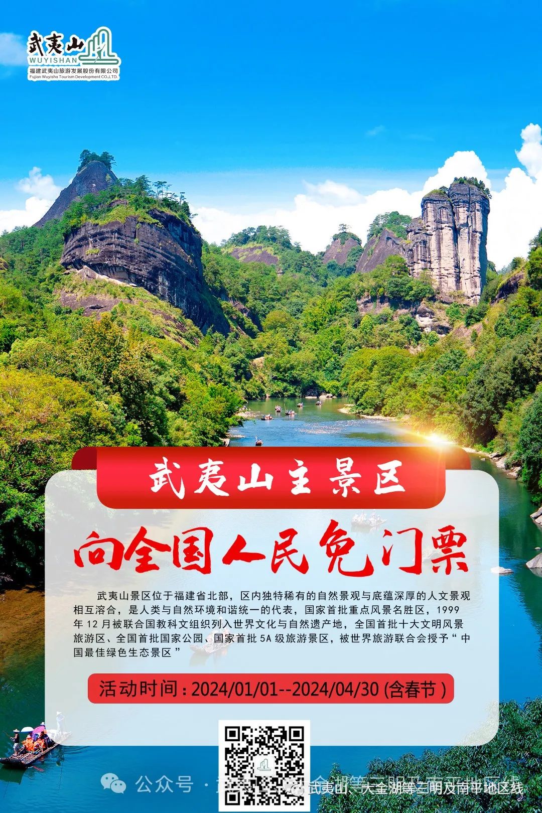 提示:以上行程仅供您参考,竹筏乘坐时间以竹筏景区安排为准,进行调整;如因特殊原因(恶劣天气、景区关门、罢工、突发事件、防疫要求等政府行为)造成损失,我社将协助减少损失,产生费用游客自理;(注1:如特殊原因无法漂流退110元/人、武夷山景点门票实行联票制、如有个别景点不参加不退费用。 注2:春节退团细则,48小时前取消收取30%团款损失,24~48小时内取消收取40%团款损失;24小时内取消收取50%损失,旅游中途取消不退团款;注3:如遇台风去程列车停运无法出行,火车站通知可全额退票的情况,我社可代客人退往返火车票,产生火车票购票手续费及人工费20元/人由游客承担)