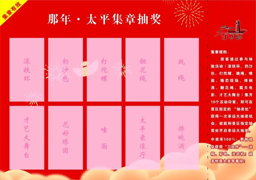 ,并附言【那年·太平 谁和我一起去】即可在活动期间免费领取集章票一张,集齐所有印章,即可在现场抽奖处参与抽奖!重磅大奖——三大件!!