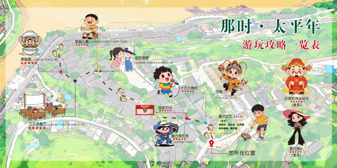 这次我们在太平古镇为你复刻一场穿越时空的怀旧盛宴:港风模仿秀、复古婚礼、经典老电影放映,还有滚铁环、扔沙包、打陀螺等童年游戏,更有五路财神巡游、摔碗酒等民俗体验,白天嗨玩不停,夜晚回味悠长,带你解锁春节新玩法!