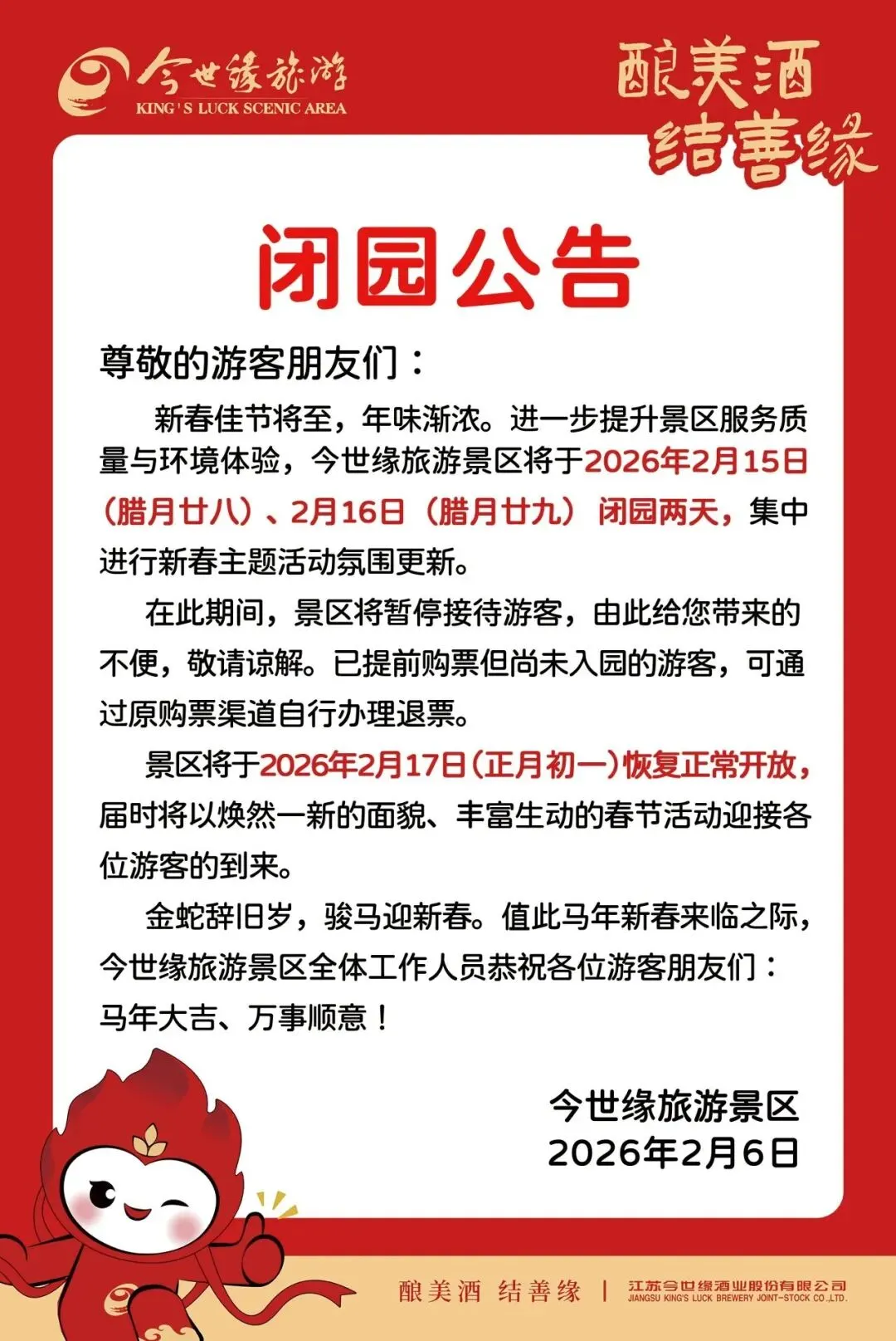 今世缘景区闭园公告