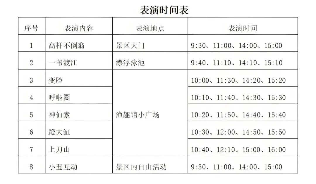 惊险连连的高杆不倒翁、飘逸灵动的一苇渡江,还有变脸、蹬大缸、上刀山等经典震撼的传统绝活,幽默滑稽的小丑互动,每天四个时段轮番上演。