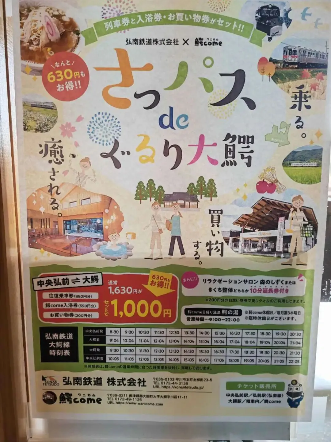 强烈推荐搭弘南电车的买さっパス,非常划算1000日元包括往返车票+鳄come日归温泉入场券+鳄come200日元购物券。