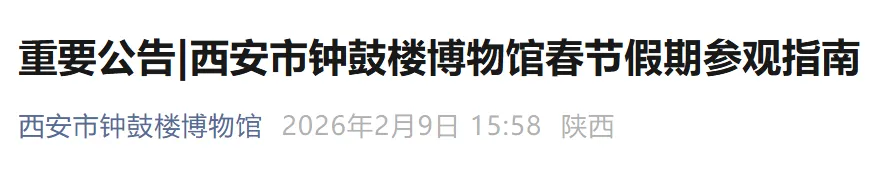 2026年新春佳节将至,现将西安市钟鼓楼博物馆春节期间开放时间公告如下: