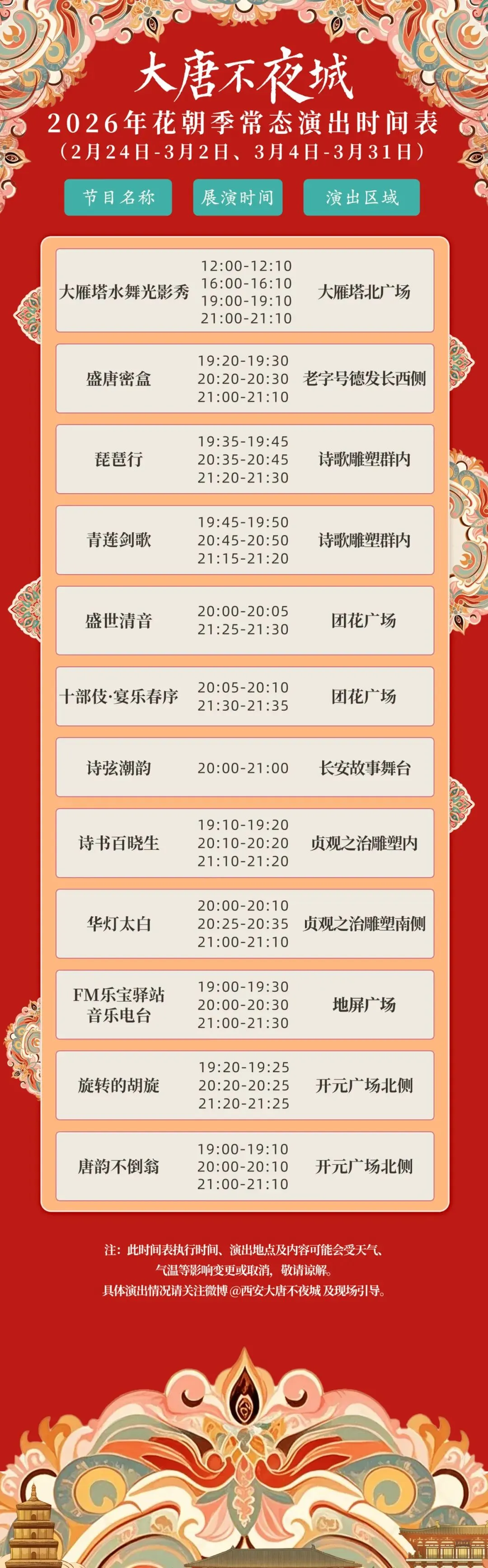 关注天气:演出时间、地点可能因天气调整,出行前可关注@西安大唐不夜城 官方微博或现场引导。