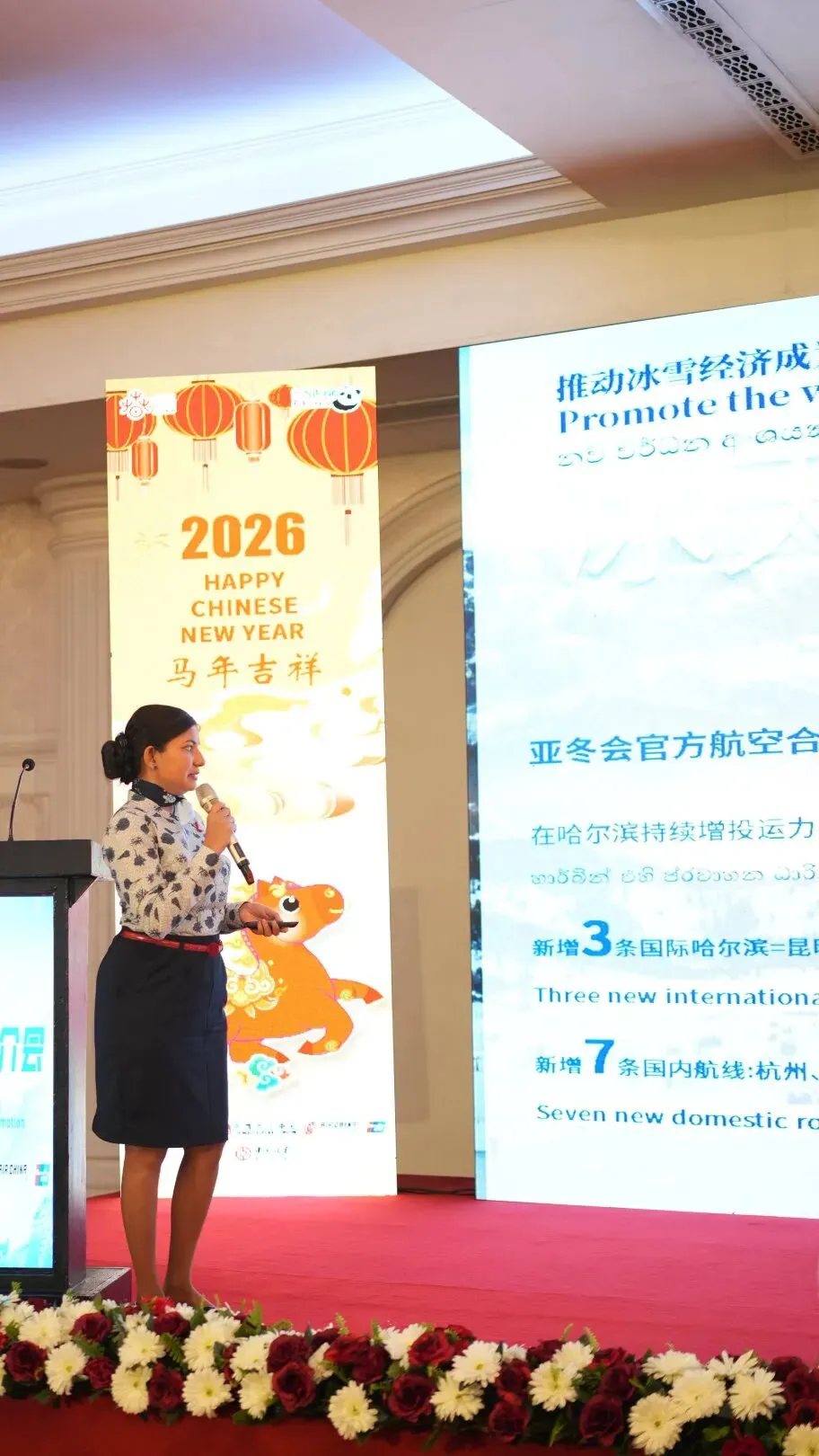 On February 6, on the eve of the traditional Chinese "Spring Festival," the "Nihao! China" Winter Tourism Promotion Event was held in Colombo. The event was hosted by China Cultural Center in Sri Lanka and co-organized by Air China, China Eastern Airlines, and UnionPay International. The initiative aimed to introduce China's winter tourism resources and cross-border travel facilitation measures to the Sri Lankan tourism industry and related sectors, thereby promoting cultural exchange and tourism cooperation between the two nations. Over 100 representatives from the Sri Lankan tourism, financial, and business sectors, as well as relevant Chinese enterprises, attended the event.