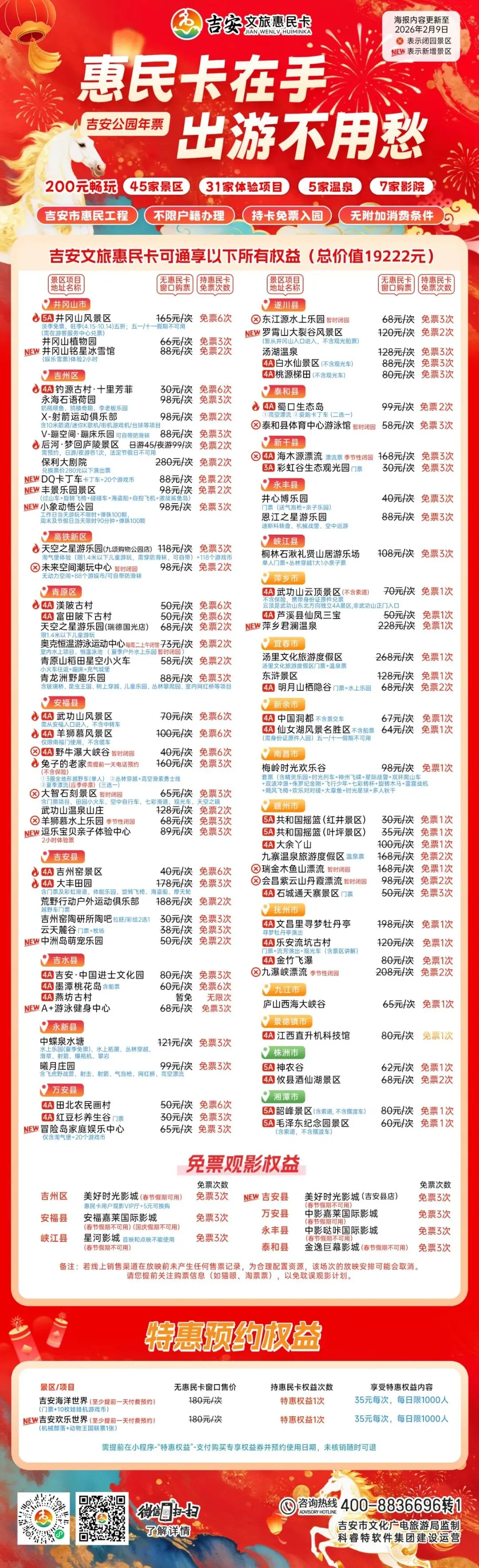 大家好!2026年春节假期游玩体验高峰期即将来临,吉安文旅惠民卡温馨提醒: