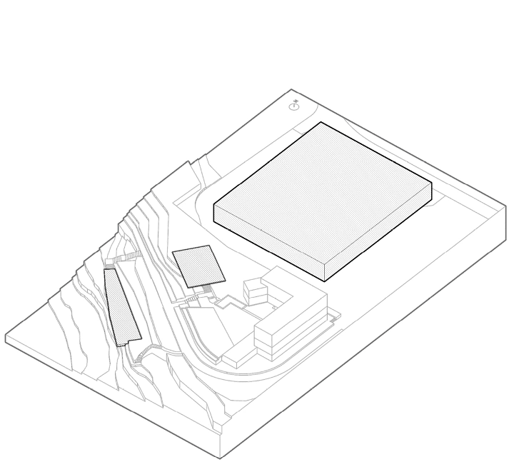 NO.1 尺度的回归与场景的置换 项目场地位于村入口停车场附近,连接崖畔游步道,毗邻村民居所,原用地范围内建有一座体量巨大的白色方盒体厂房和一上一下错落的悬崖观景平台。在对原有地形和游客、村民流线进行梳理后,建筑设计上采取了两种策略。