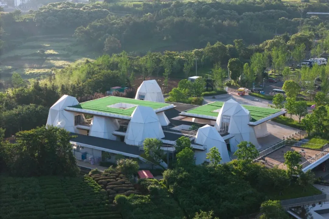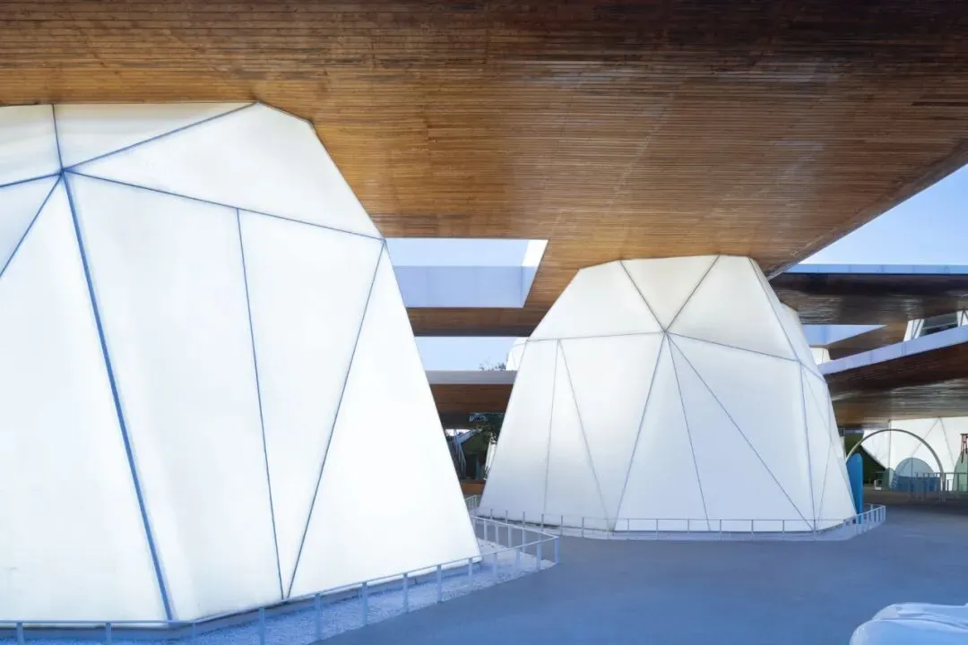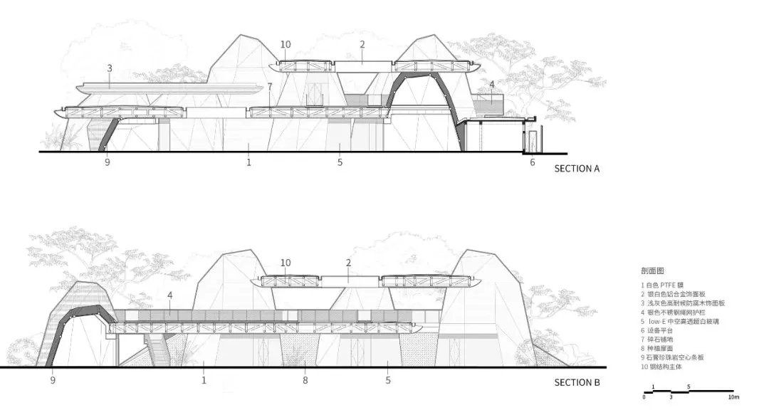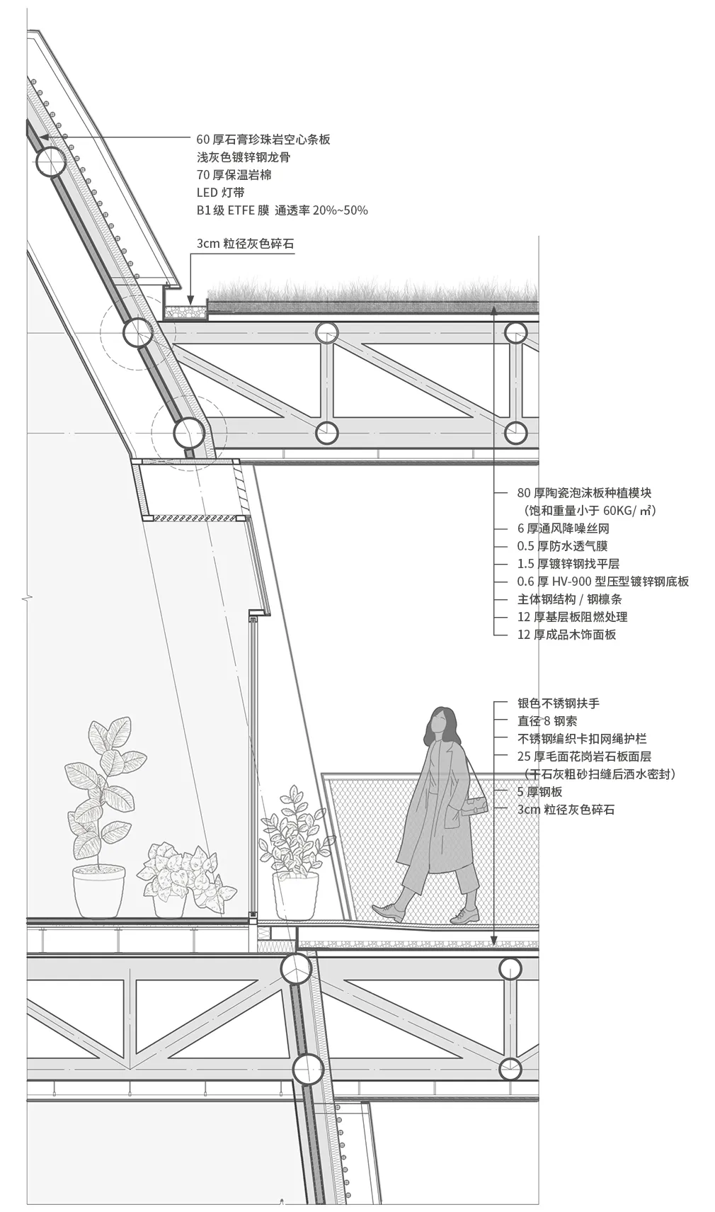 大屋顶下表面则采用原木色碳化防腐松木板,为近人尺度增添温暖质朴的视觉质感。大屋顶上部则以金属屋面作为基层,并根据是否上人的需求,分别设置了以砾石作为保护层的上人屋面和采用单元式泡沫种植模块的非上人植草屋面,既减小了屋面构造厚度和荷载,同时也营造出云上草甸的观赏效果。