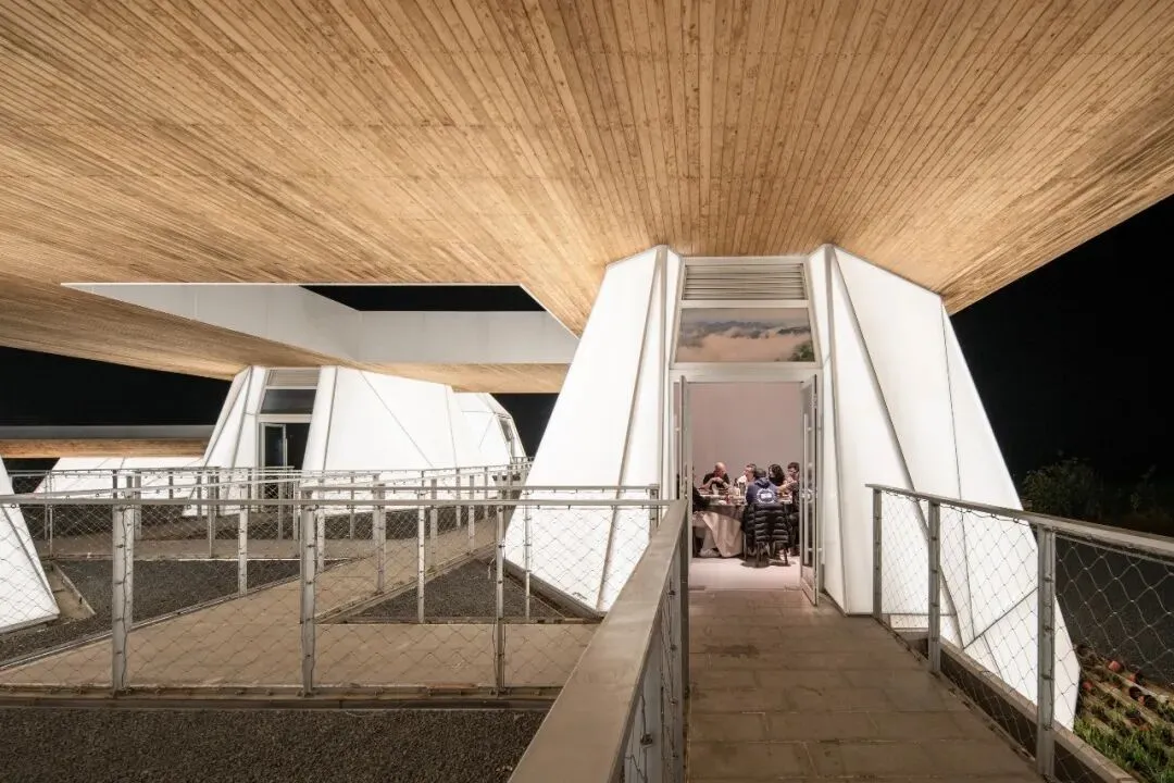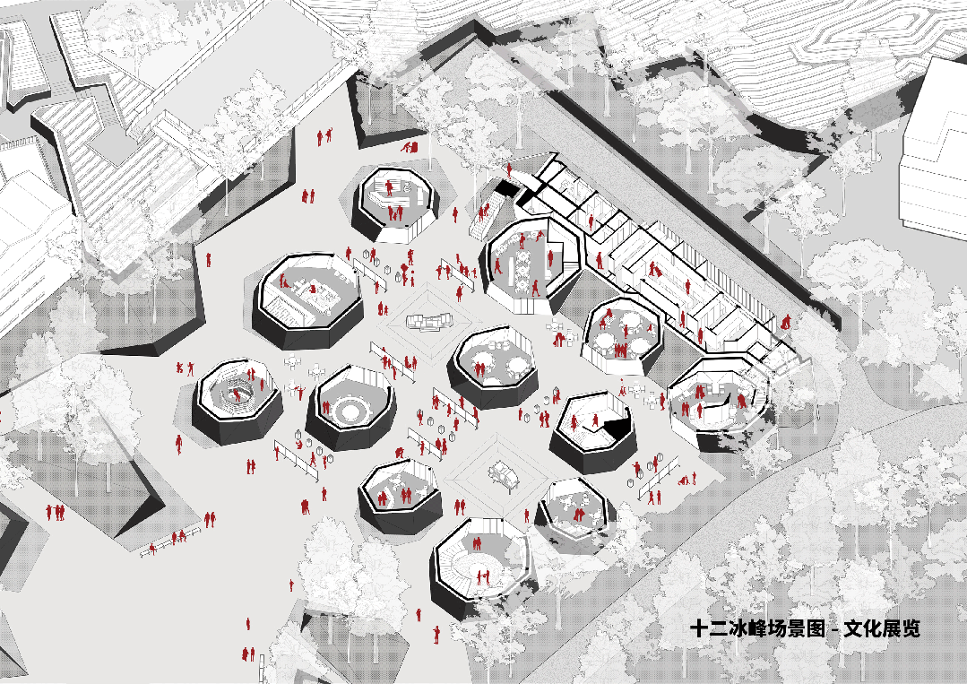 “云峰十二重”建筑单元的原型从户外露营帐篷获得启发,设计上以简洁的几何切削式为其塑形。群组的雕塑感体量仿佛一组十二座高低不同的“飞来”冰峰,也与远处的“十九峰”遥相呼应。