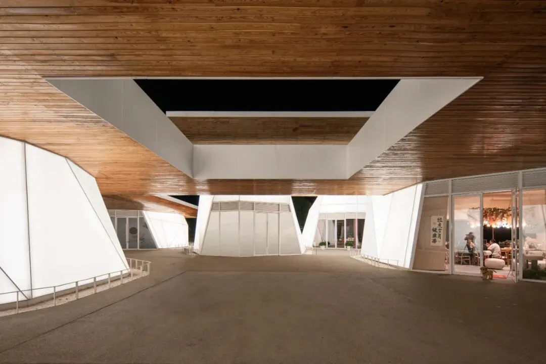 覆盖院落的片板重叠交织,构成了类似于屋顶的空间限定,其中开洞则形成了类似于天井的形式,为地面的院落和二层的中庭导入充足的光照和通风,也由此形成了不同层次的灰空间,为商业外摆、村民集会、游客集散、乡村市集和会展活动等不同的运营场景,均提供了灵活可变的空间。