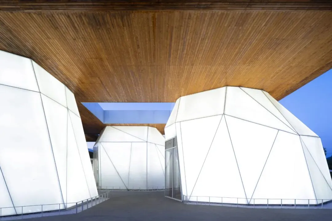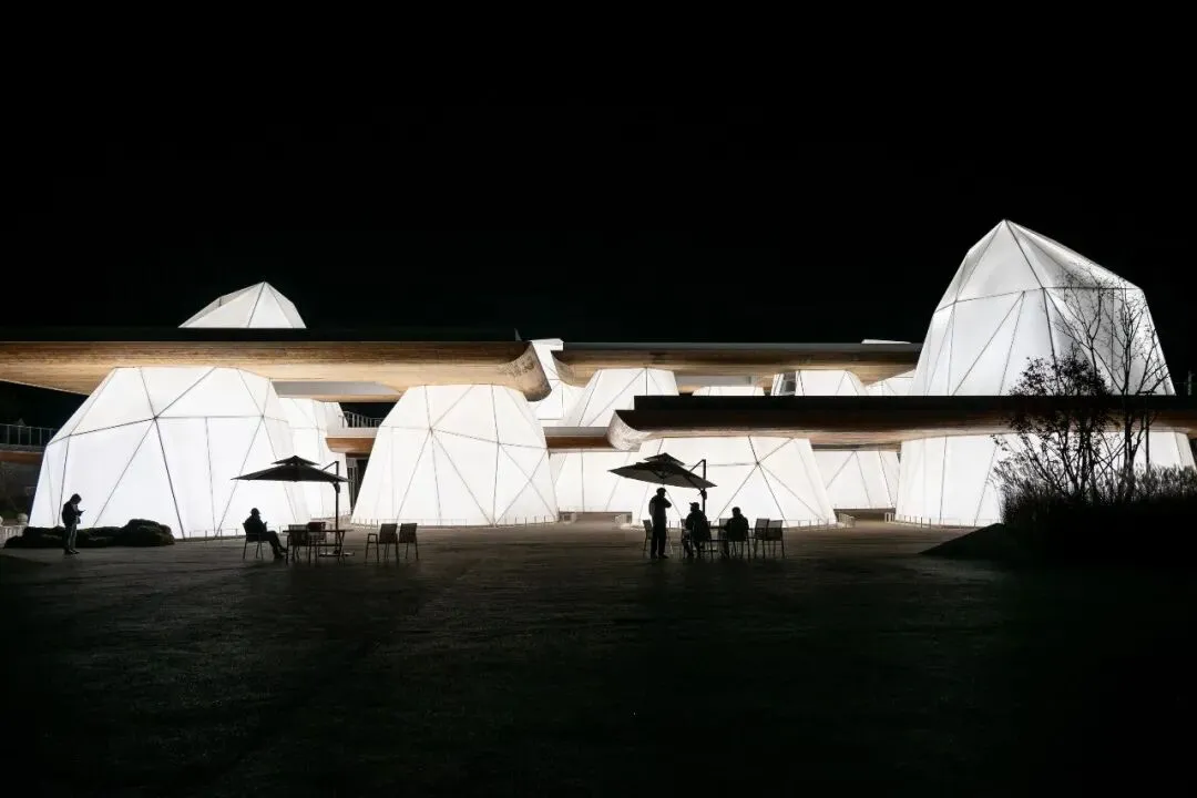 NO.3 差异化形式与工业化建造 建筑的结构选材出于其不规则形体、环境抗性、施工便捷等多方面的考虑。云峰的非标形体采用钢结构主体覆半透明性材料PTFE,以雕塑感的形式,在自然光下呈现出柔和的半磨砂质地。而膜下均匀排布LED灯带,透过PTFE膜在光线作用下产生半透明的朦胧效果,使建筑成为自发光体,为入夜后的各种活动提供自然均匀的光环境,也使整个建筑在夜间成为过往冷清乡村中的一个活力地标。