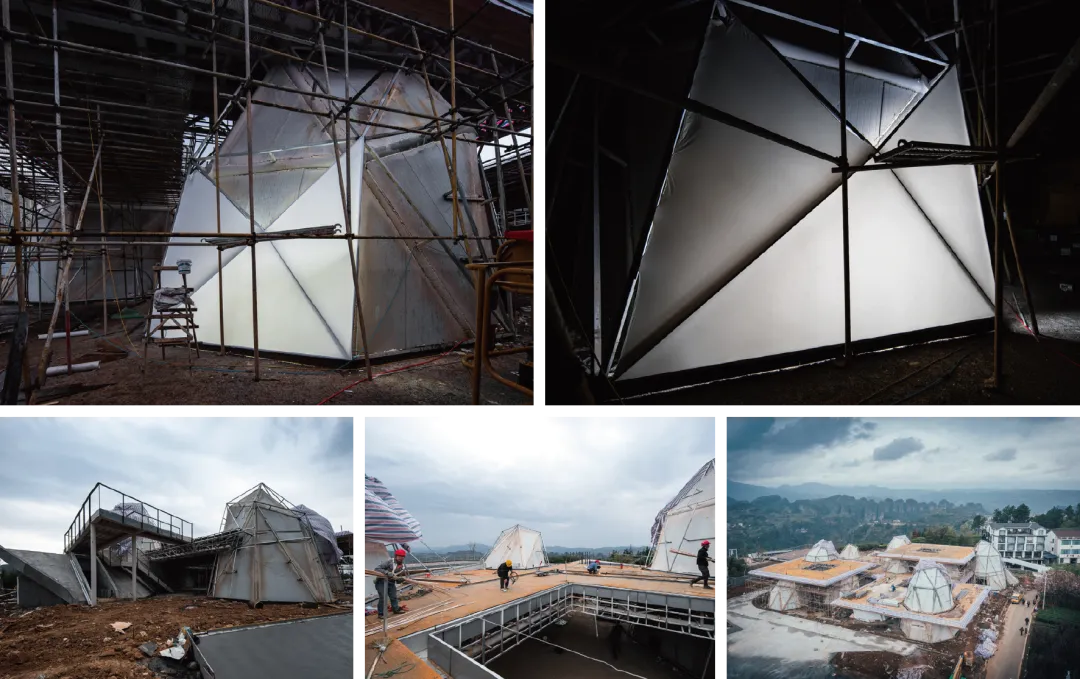 钢框架结构的所有主要构件均在工厂预制完成,通过装配式的构件精度,减少了现场施工的耗时,并削弱对周边村民和环境的干扰及影响。云峰外表面的膜材在通过多种的耐候性、透光性、防火性试验后,最终选择了PTFE膜材,其质地轻便、易于运输和安装,而在工厂裁剪成所需形状后,可以快速在现场安装固定。