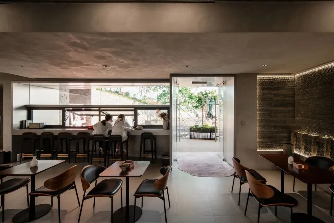 室内设计最大化外部风景的观赏体验,由场地特征提取出来的“翠绿”与“云雾”提炼转换为室内空间与材质的语言,由自然山野强调空间享受。谦和低调的用色与软装,营造人与自然相处的平和心境——“云行不自知,树静谢风迟。行至路穷处,恰是观景时”。