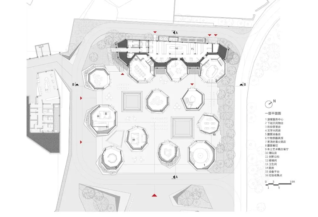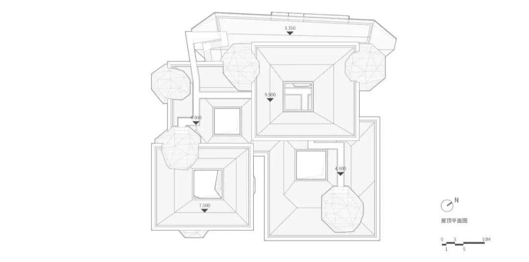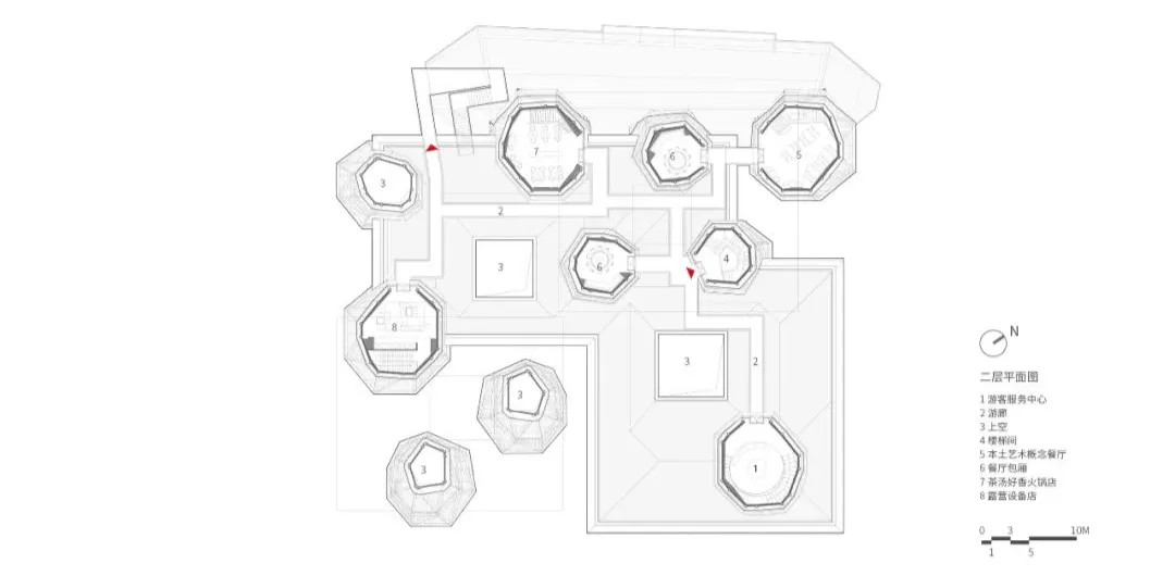 NO.2 单元化平面和多元化场景 “云峰十二重”的平面布局以散点聚落的方式,强调通过性,建筑与环境、室内与室外互相渗透。首层十二个单元分组团不等距地围合排布,单体的开口朝向中心,对外形成统一完整的纯粹界面,对内则面向中心院落形成丰富的展示面和开口,由空间的具体内容赋予一系列相似的单体以独特性。