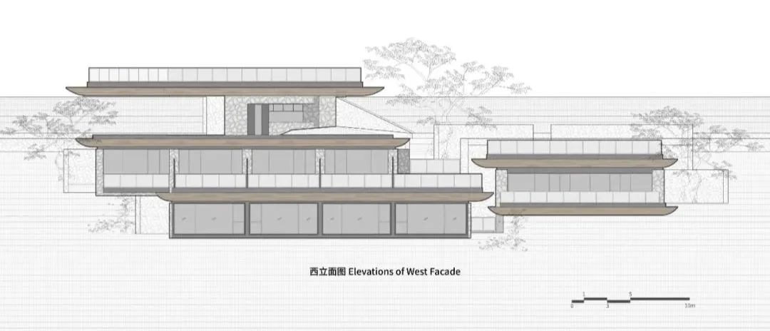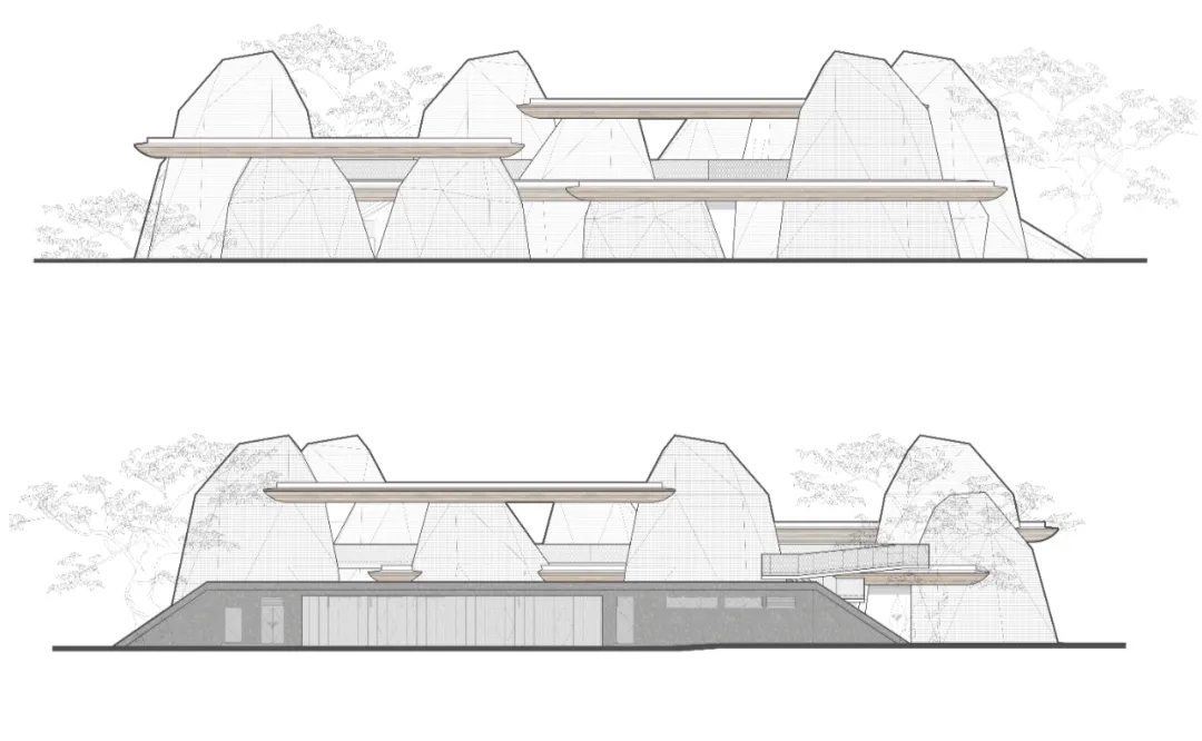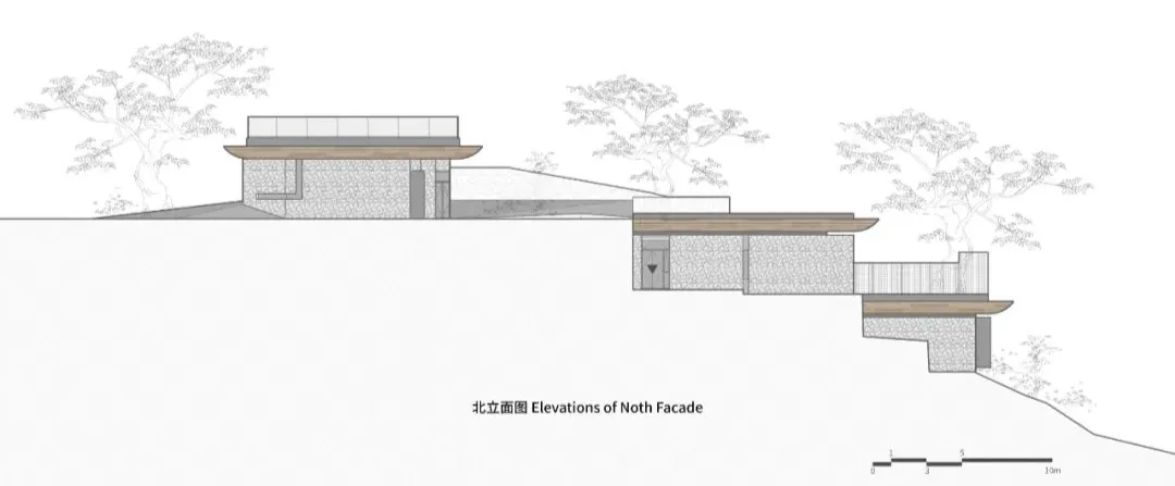 下观景台进一步向外拓展,作为屋面向下跌落新的片状平台,并由此生成新的建筑体量。民宿建筑采用了与云峰不同的材料语言,以本地出产的天然毛石和深色烧杉板为主,将建筑体量完全隐匿于山体中。
