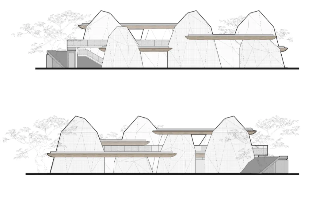 十二座“云峰”采用单元化钢结构模块,用以包容迥异的功能空间。不同尺度的平台犹如缭绕山间的层云插接串联群峰,形成多种标高的开放观景平台,从而最大限度地为后续商业运营创造具有遮蔽的弹性空间。由轻钢结构构成的浮空栈道连接垂直交通,轻盈地蜿蜒迤逦于平台和群峰之间,形成了自由流动、立体复合的开放漫游系统。