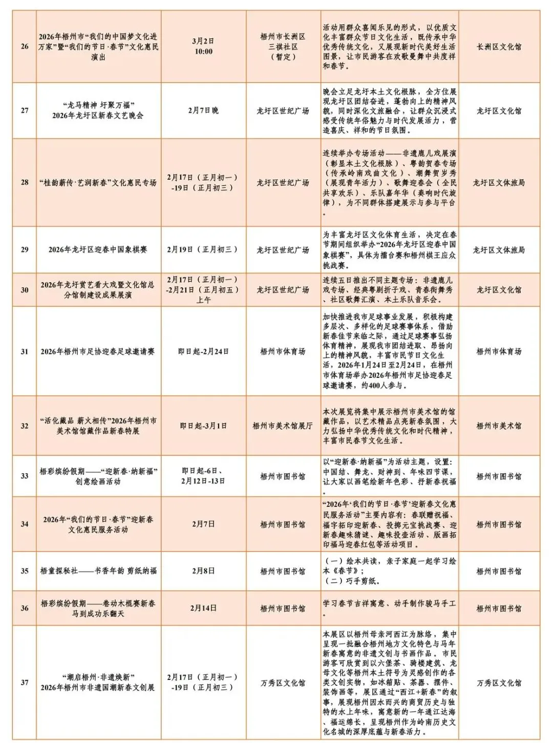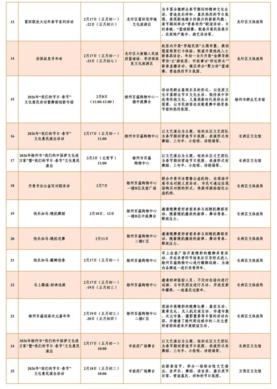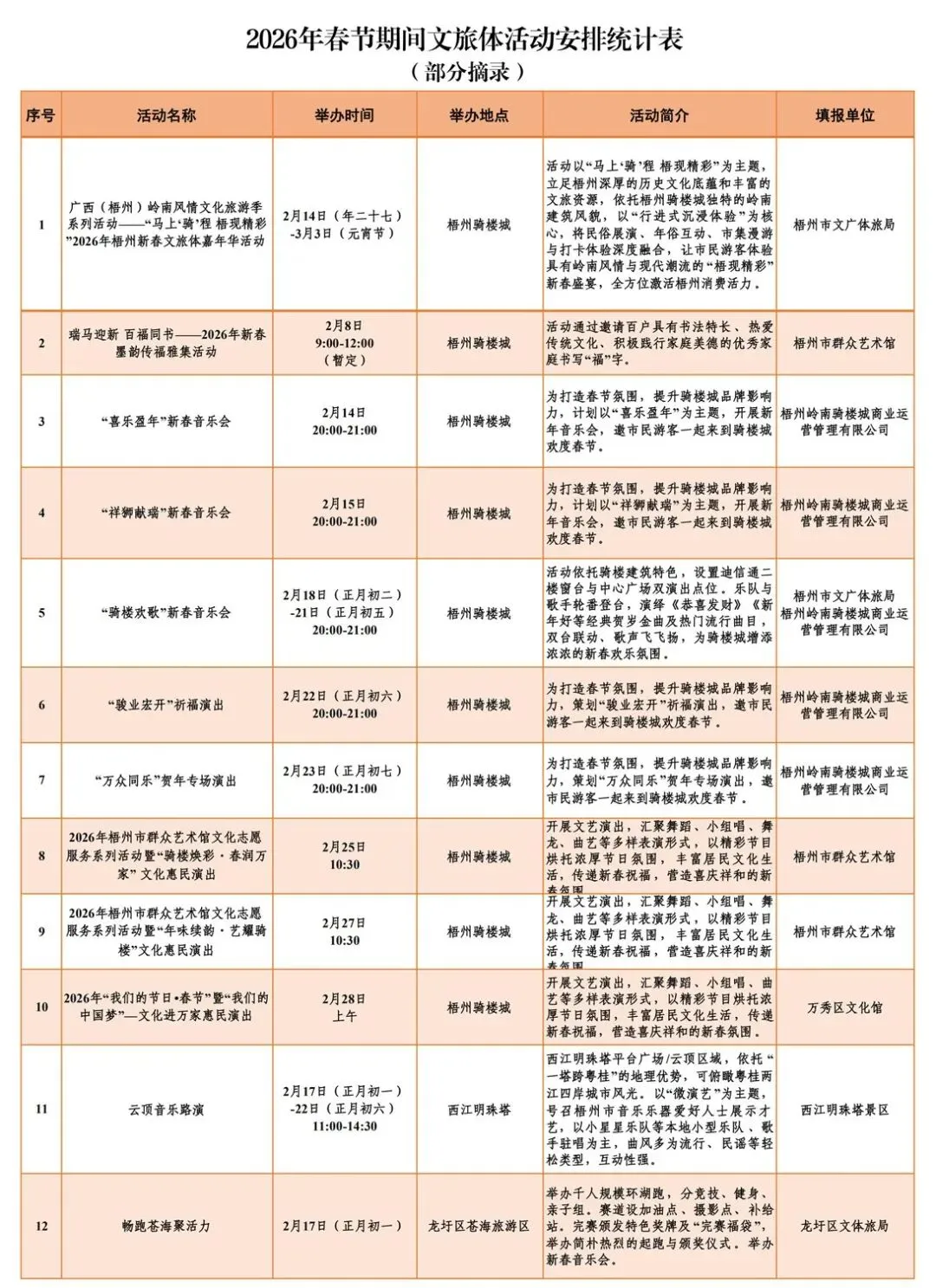 内容:活动以“马上‘骑’程 梧现精彩”为主题,立足梧州深厚的历史文化底蕴和丰富的文旅资源,依托梧州骑楼城独特的岭南建筑风貌,以“行进式沉浸体验”为核心,将民俗展演、年俗互动、市集漫游与打卡体验深度融合,让市民游客体验具有岭南风情与现代潮流的“梧现精彩”新春盛宴,全方位激活梧州消费活力。