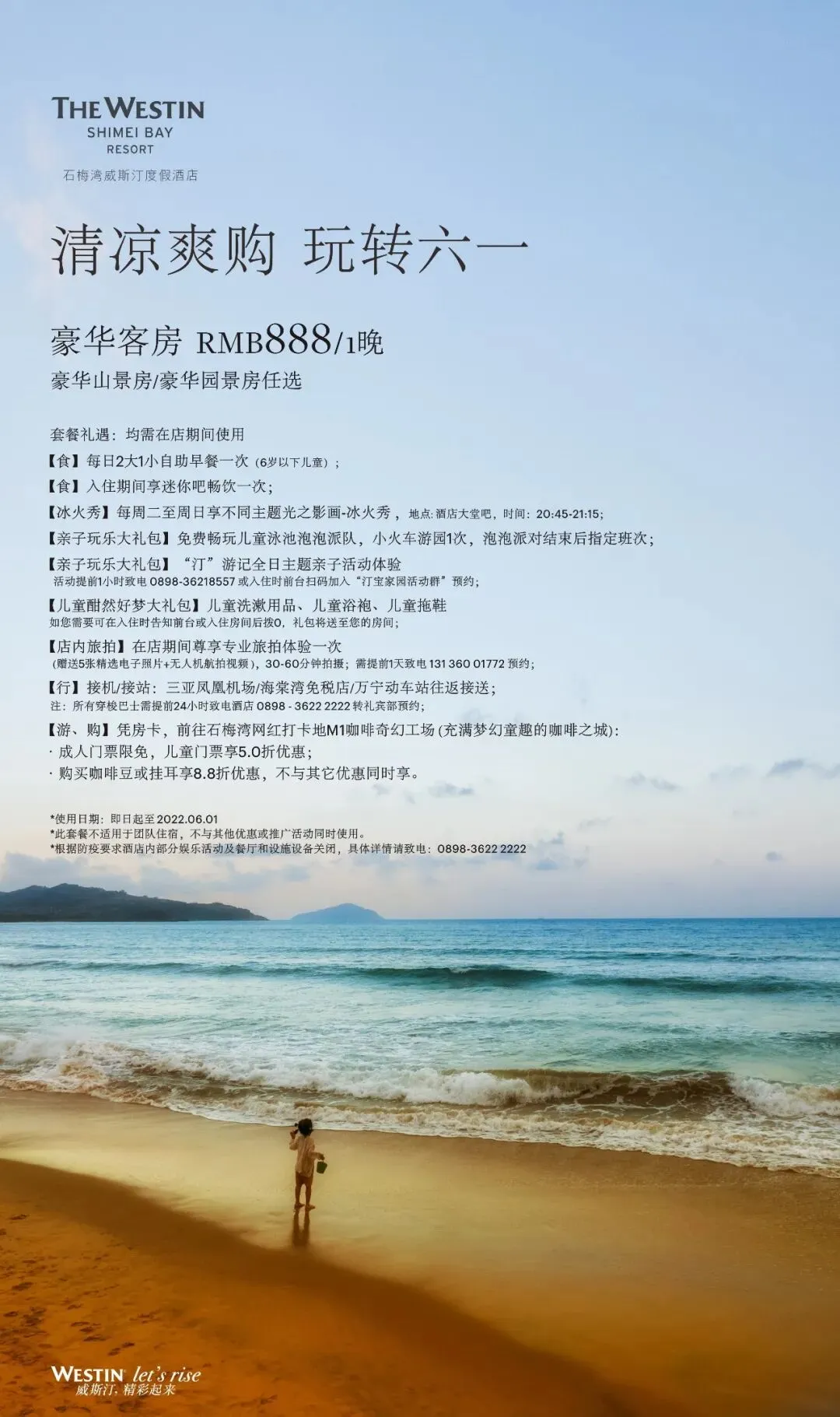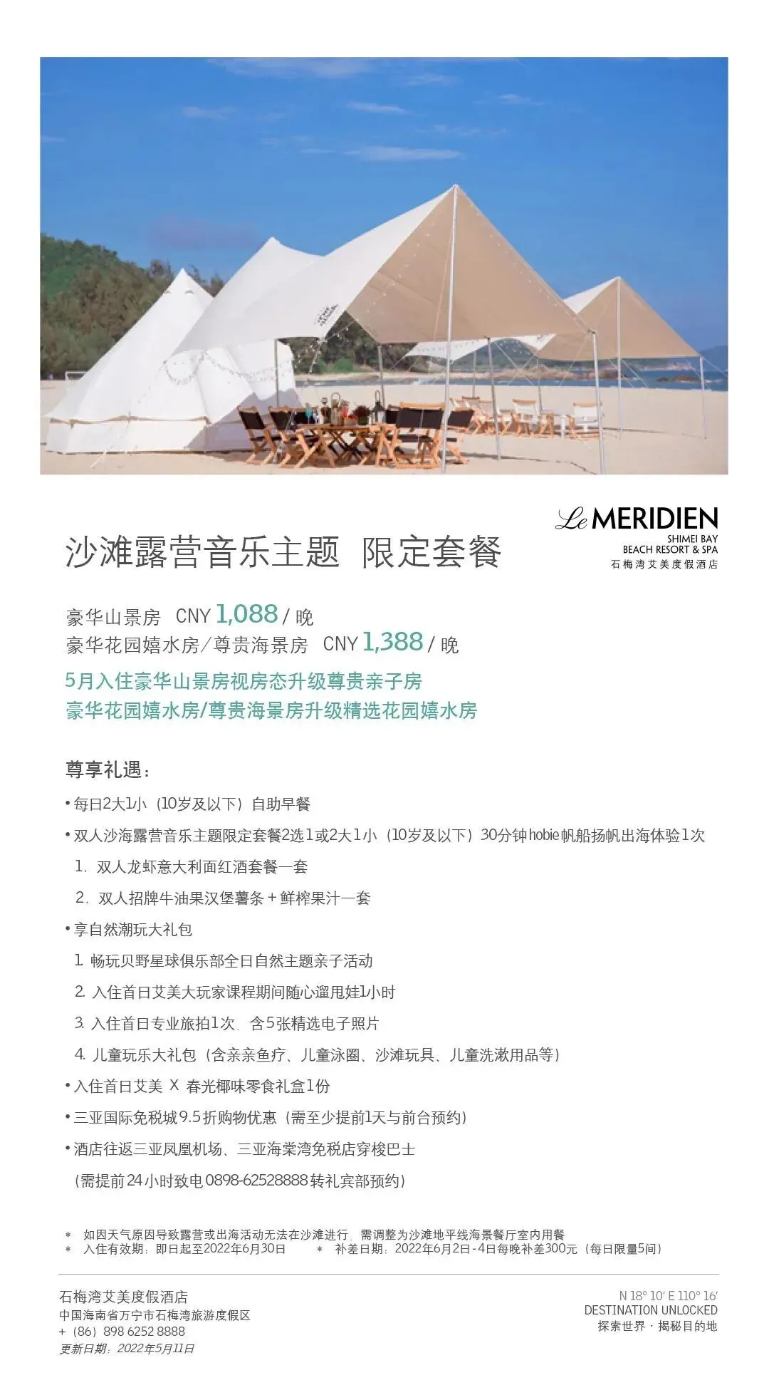 石梅湾艾美度假酒店推出“艾美吃喝玩乐优惠劵大礼包”,并结合新潮的露营业态,打造内容丰富的“沙滩露营音乐主题 限定套餐”;石梅湾威斯汀度假酒店推出888元/晚“豪华客房套餐”;兴隆希尔顿逸林滨湖度假酒店推出629元“豪华房套餐”;神州半岛喜来登度假酒店精心策划“乐享周末·童趣时光”主题套餐,让住客一站式畅享假日生活。