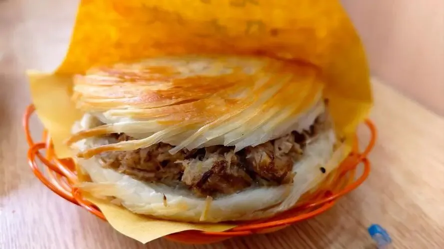路上先来潼关肉夹馍,皮酥肉香,手背全是油光,笑得真。