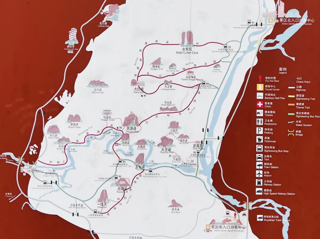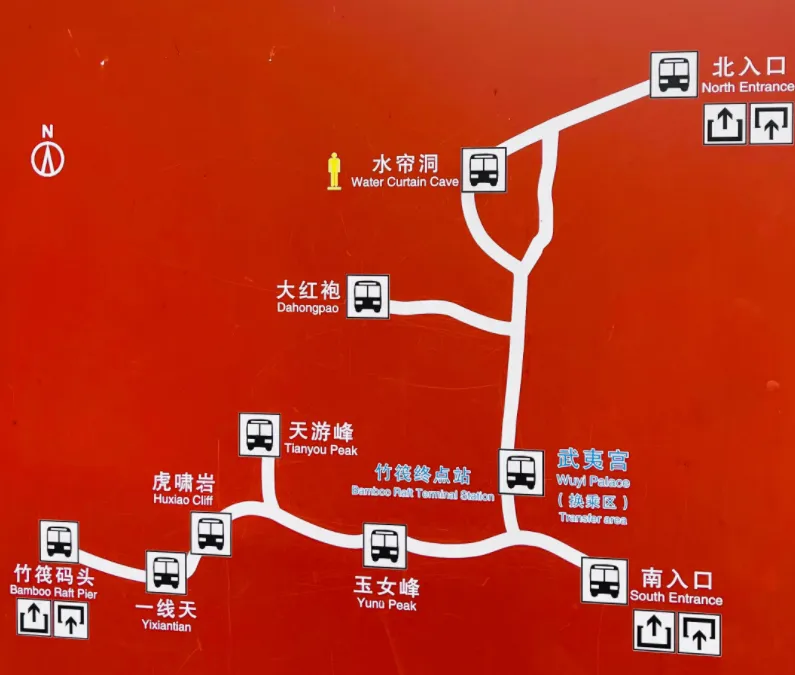 武夷山景区分为南北两处,北区的入口在三姑镇北面往市区的路边,南区的入口在三姑镇的南边。两边相隔不远,景区外滴滴也就10分钟左右,景区内则有交通车相连,在武夷宫站点换乘。