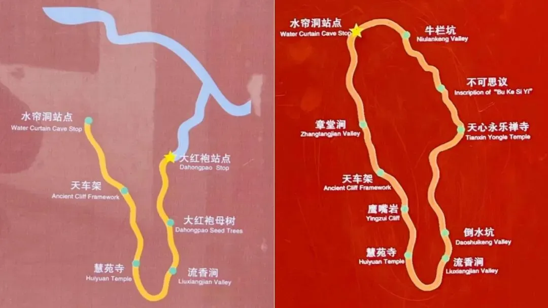 北区的行程可参考如下:入口站点——大红袍站点——水帘洞站点——北区入口站点,大红袍景区从站点进山往返约2公里,需时60分钟,水帘洞景点从景交车站点进山往返3公里,需时90分钟。游人一般都是中午到达武夷山,D1下午的行程就可以安排北区的这两个景点。