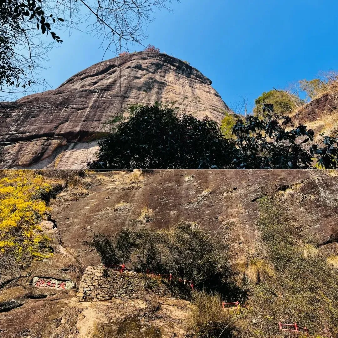 行程的终点就是这长于峭壁之上的6株大红袍母树,此段岩骨花香漫游道因此被称为大红袍景区。岩下的看板上对这六株母树有着详细的介绍,第二和第六株为300年树龄的正本株,其左右四株均为种子飘落生长出的副本株。现有的大红袍茶树均出自这六棵母树。