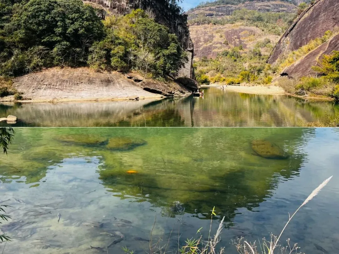 山崖之下的九曲溪水悠悠趟过,水澄澈得有点过分了,鱼翔浅底清晰可见,一叶叶竹筏自上游飘然而至,很早以前还可以下河淌水,现在应该不允许了吧。