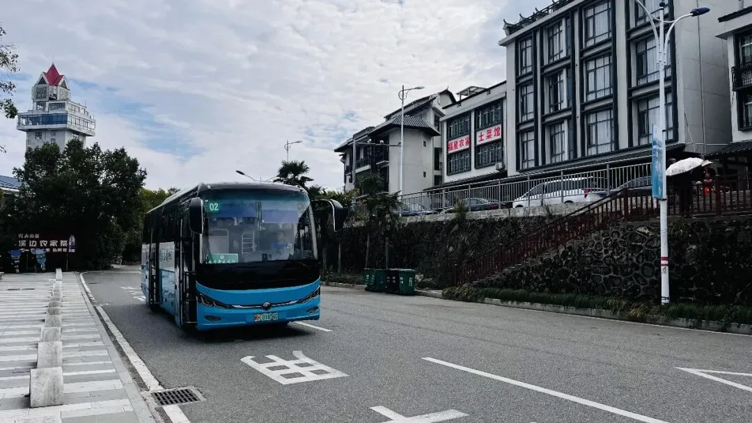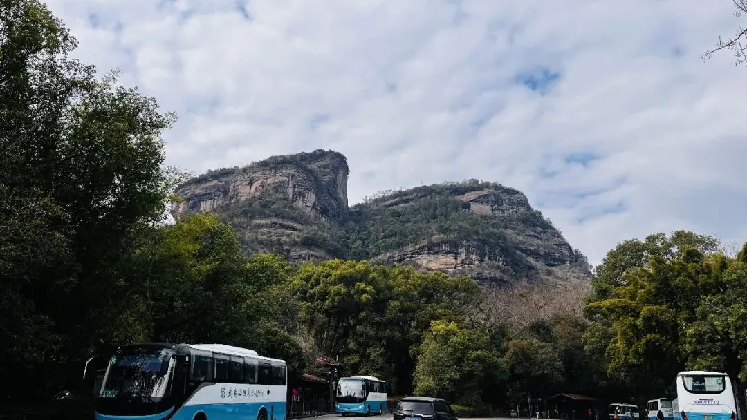 沿着一条长桥就可以到景区大门,大门后面就是交通车站点,整个车队车况保养相当可以。从北口站点出发行驶10分钟便到大红袍站点。