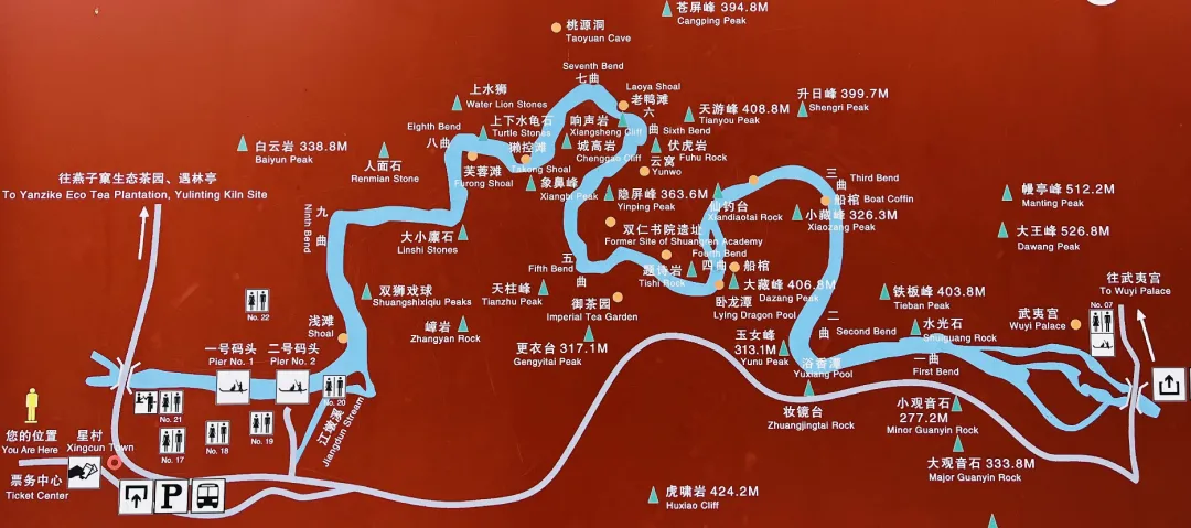 整个行程从七星村码头上船,至武夷宫码头下船,全程9公里多,根据水位高低,需时90-120分钟。