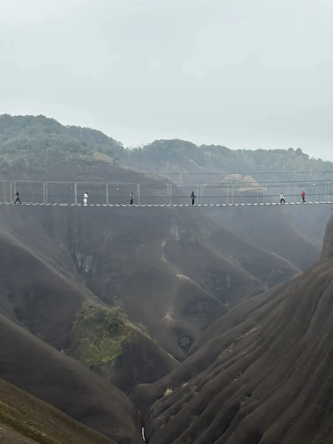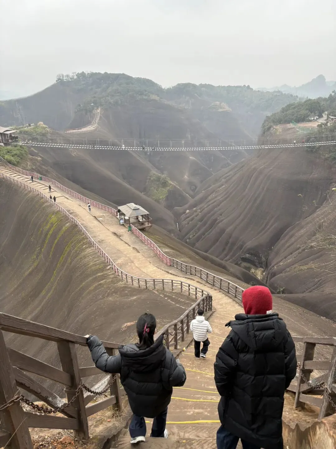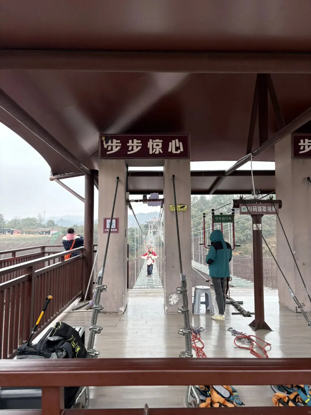 开了大概二十几分钟到了一个高山腰下车,我们再步行五分钟就到了西门检票口(那个帅哥没有骗我们),接下来我们就尽享大自然的鬼斧神功,太险太美了,迎面而来的第一个项目是“步步惊心”,我不敢玩,我家大宝真的太勇敢了,全程走在前头比大人还快,白衣服那个小不小点就是她!你看到了吗?😁