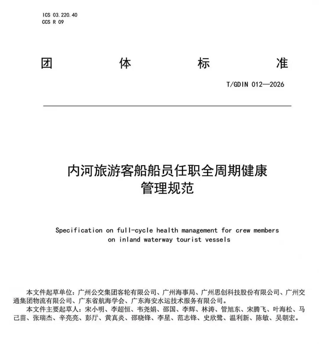 近日,由广州公交集团客轮有限公司牵头制定的《内河旅游客船船员任职全周期健康管理规范》团体标准正式发布,这是全国首个聚焦内河旅游客船船员健康管理的团体标准,填补了行业领域的标准空白,标志着内河旅游航运船员健康管理迈入标准化、系统化、全周期的新发展阶段,也为全国内河旅游客船船员健康管理工作树立了可复制、可推广的“广州样板”。