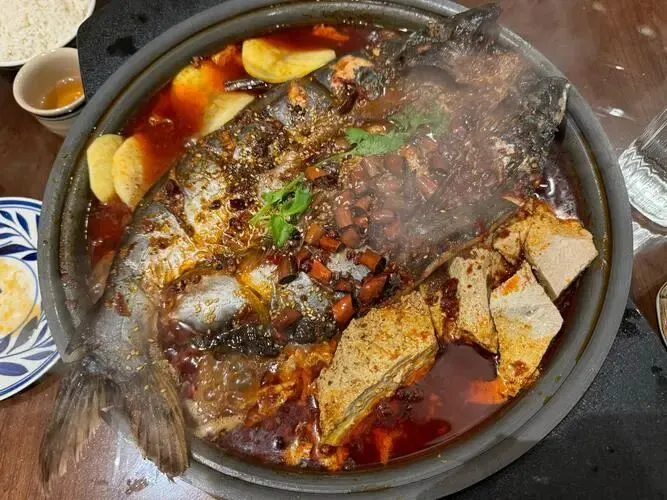 中午乌江烤鱼半边,蒜蓉加泡椒,骨头都想啃干净。
