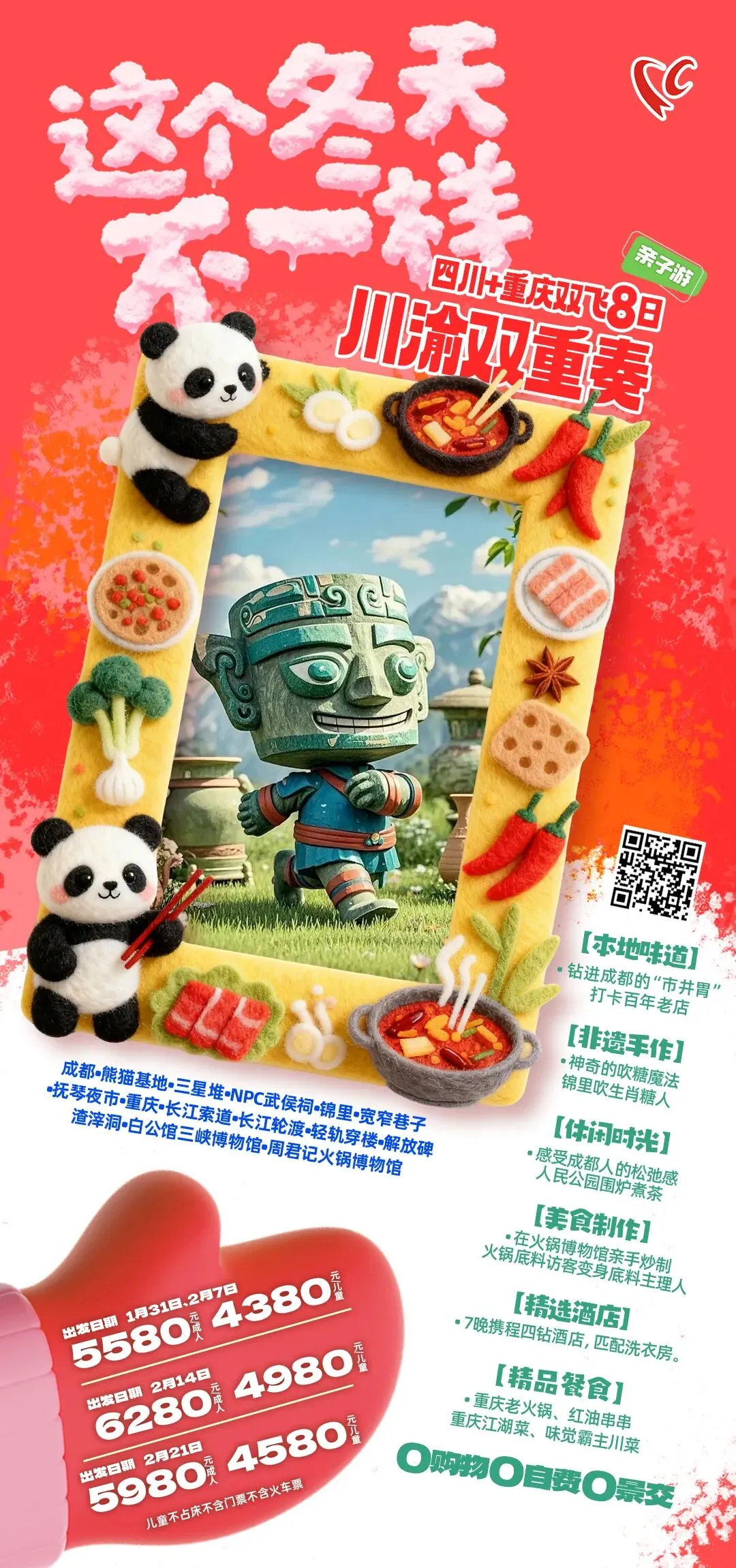 6.川渝双重奏四川重庆双飞8日游。0购物0自费。