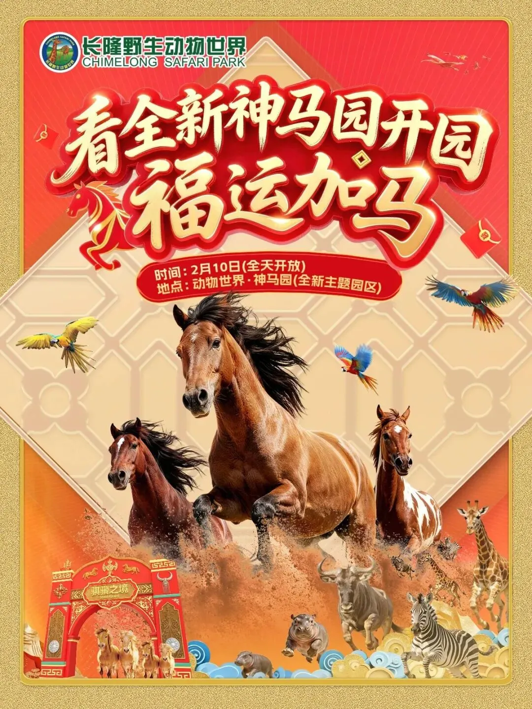 整合长隆野生动物世界、欢乐世界、大马戏等园区,推出“全球国宝齐贺岁”“财神村互动”等活动,野生动物世界新增马园迎客,欢乐世界开放顶级游乐设施,适合亲子家庭沉浸式游玩。