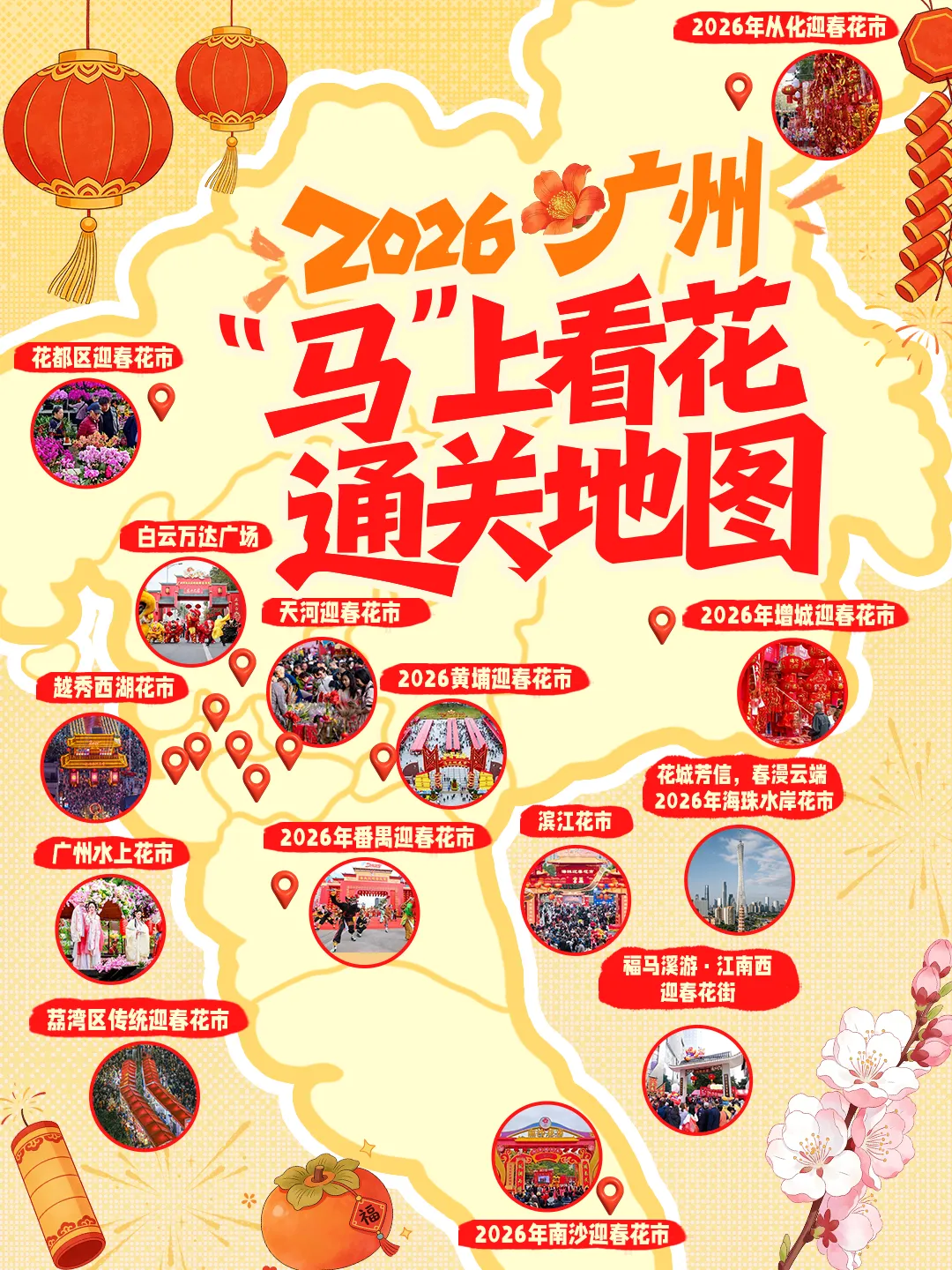 越秀西湖花市(百年历史)、天河花市(重返体育中心)、荔湾水上花市(非遗特色)三大核心花市,可选购年花、民俗手作、特色小吃,感受老广过年氛围。