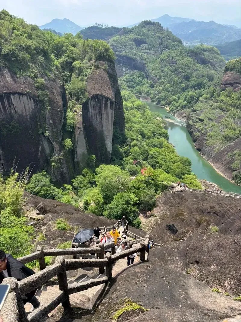 天游峰必须爬。半山腰往下望——九曲溪就像一条碧绿的丝带,在三十六峰之间弯弯绕绕, 这种视角,绝了 。虽然台阶有点虐腿,但爬上去的瞬间你会觉得值哭。