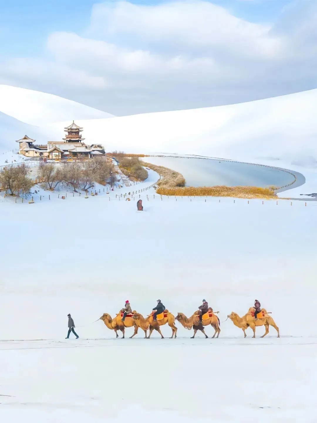 鸣沙山上薄薄一层雪,像给金色沙丘盖了一条白绒毯子。月牙泉就安安静静地卧在沙丘怀抱里——几千年了,不干涸,不消失。想想就觉得不可思议。