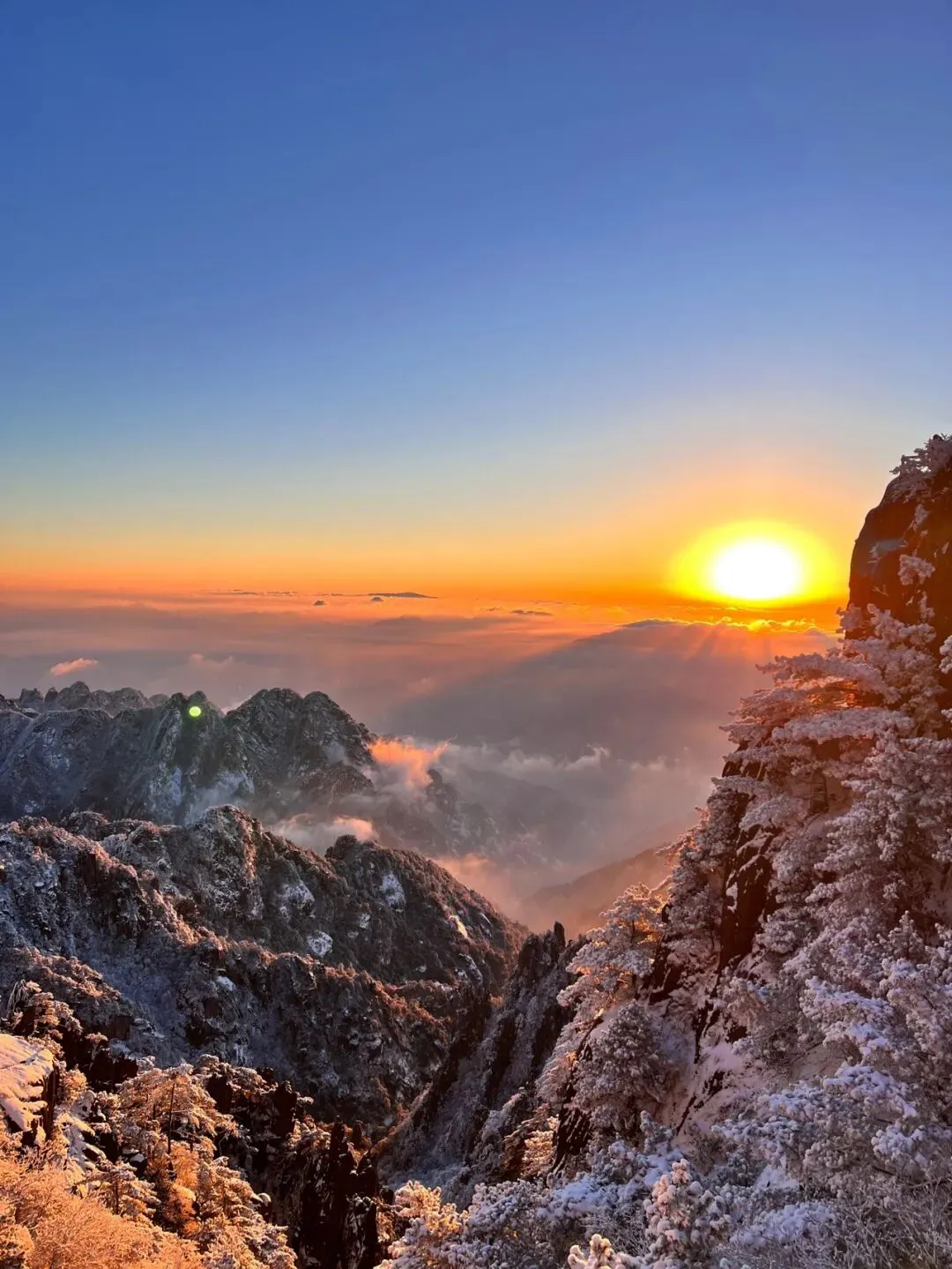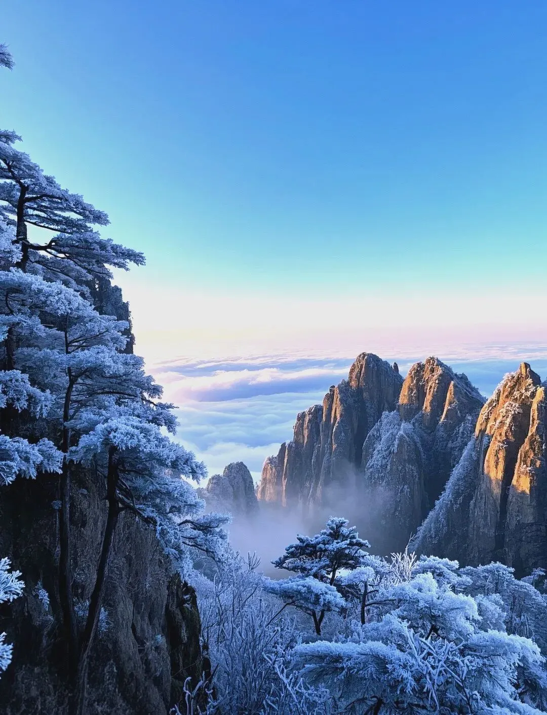 冬天的黄山,才是黄山最炸裂的状态。雾凇挂满迎客松的枝头,整座山银装素裹——远远望去像不像一幅水墨画?但比水墨画还多了一层晶莹剔透的质感。