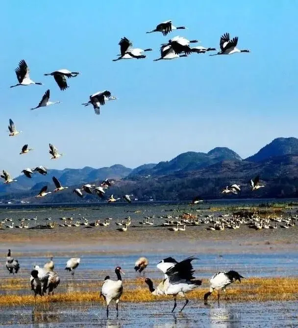 每年冬天,全球大约五分之一的黑颈鹤种群会飞到威宁草海过冬。2025年12月的监测数据显示数量已经超过2800只,创了历史新高……再加上其他候鸟,整个越冬鸟群超过10万只。