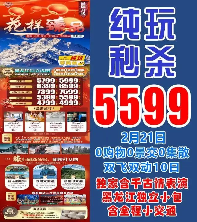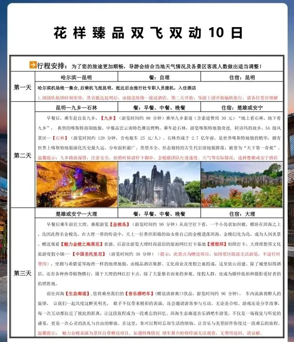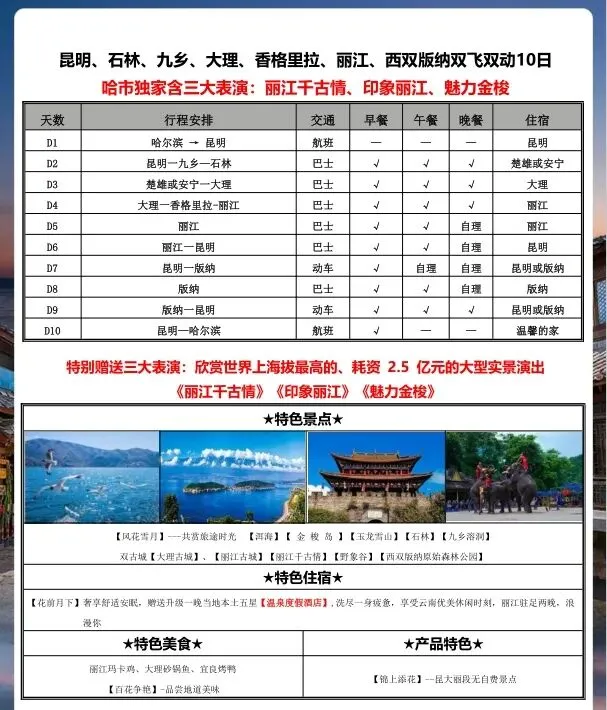 【肇东纵横旅游寒假团】2月21日 云南昆明+大理+丽江+版纳+虎跳峡双飞双动纯玩10日游 黑龙江独立成团