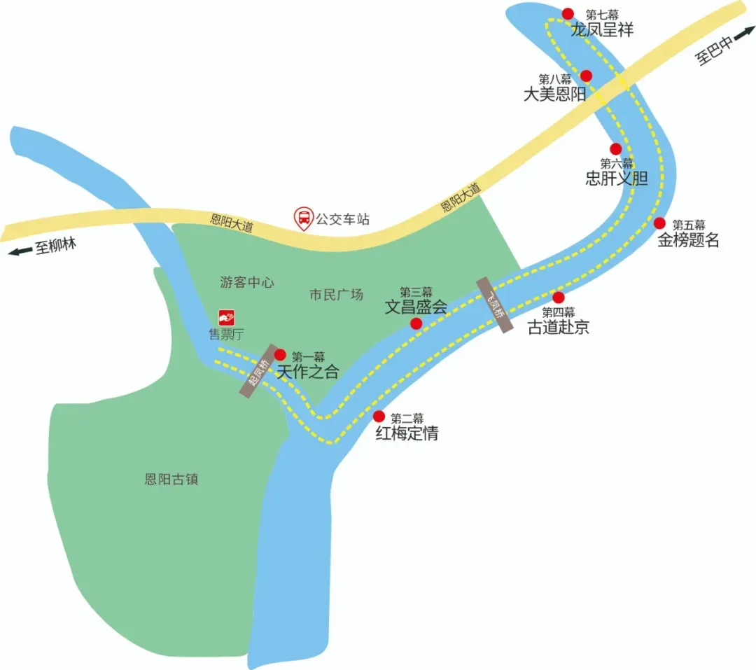 恩阳船说夜游航行路线从启航码头出发,经过起凤桥、飞凤大桥、恩阳河大桥等景点,游船往返全程6公里。