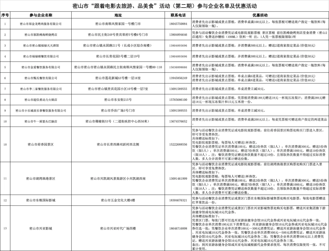 为深入贯彻落实省、市关于开展“跟着电影过大年”系列活动安排部署,促进春节期间电影、旅游、餐饮行业消费,推动电影、旅游、餐饮产业深度融合、多边共赢,市委宣传部、市商务局、市文体广电和旅游局联合开展第二期“跟着电影去旅游、品美食”活动。 一、活动时间 2026年2月10日至2月23日 二、活动范围 密山市 三、参与活动企业 郑金龙烤肉服务有限公司、郭凯峰海鲜烧烤店、福禄天天酒馆、福禄顺餐饮有限公司、金爱餐饮服务有限公司、甄氏餐饮有限公司、李二家餐饮服务有限公司、超信煮动力火锅店、小乐城故乐事餐饮服务有限公司、牛一厨筋头巴脑店、荷香园景区、湖湾渔港景区、东粮国际影城、兴亚影城。 四、活动内容