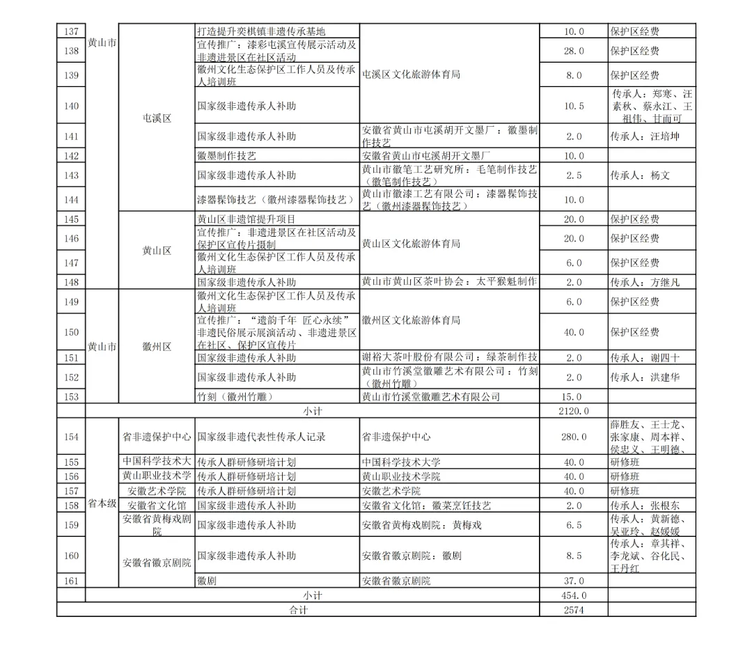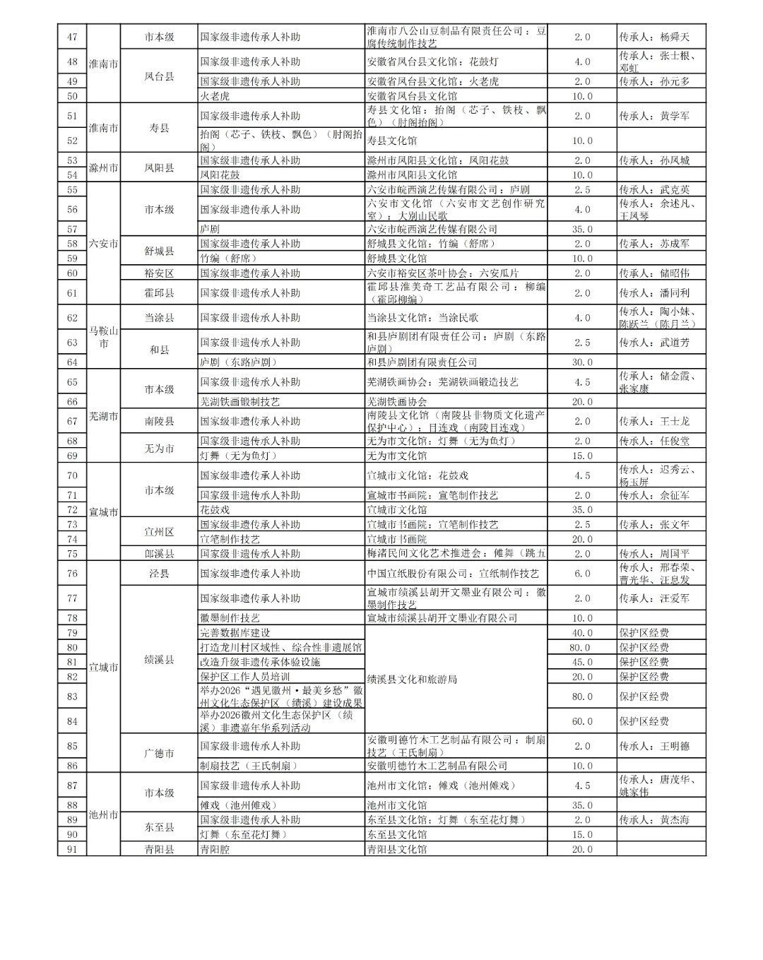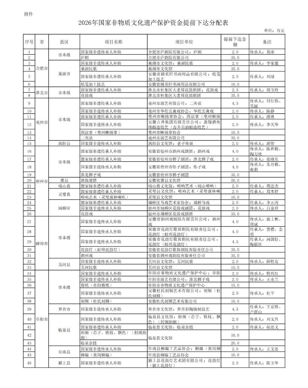 根据《安徽省财政厅关于提前下达2026年国家非物质文化遗产保护资金预算的通知》(皖财教〔2025〕1317号),现提前下达2026年国家非物质文化遗产保护资金,主要用于国家级非物质文化遗产管理和保护等(具体项目及金额见附件)。